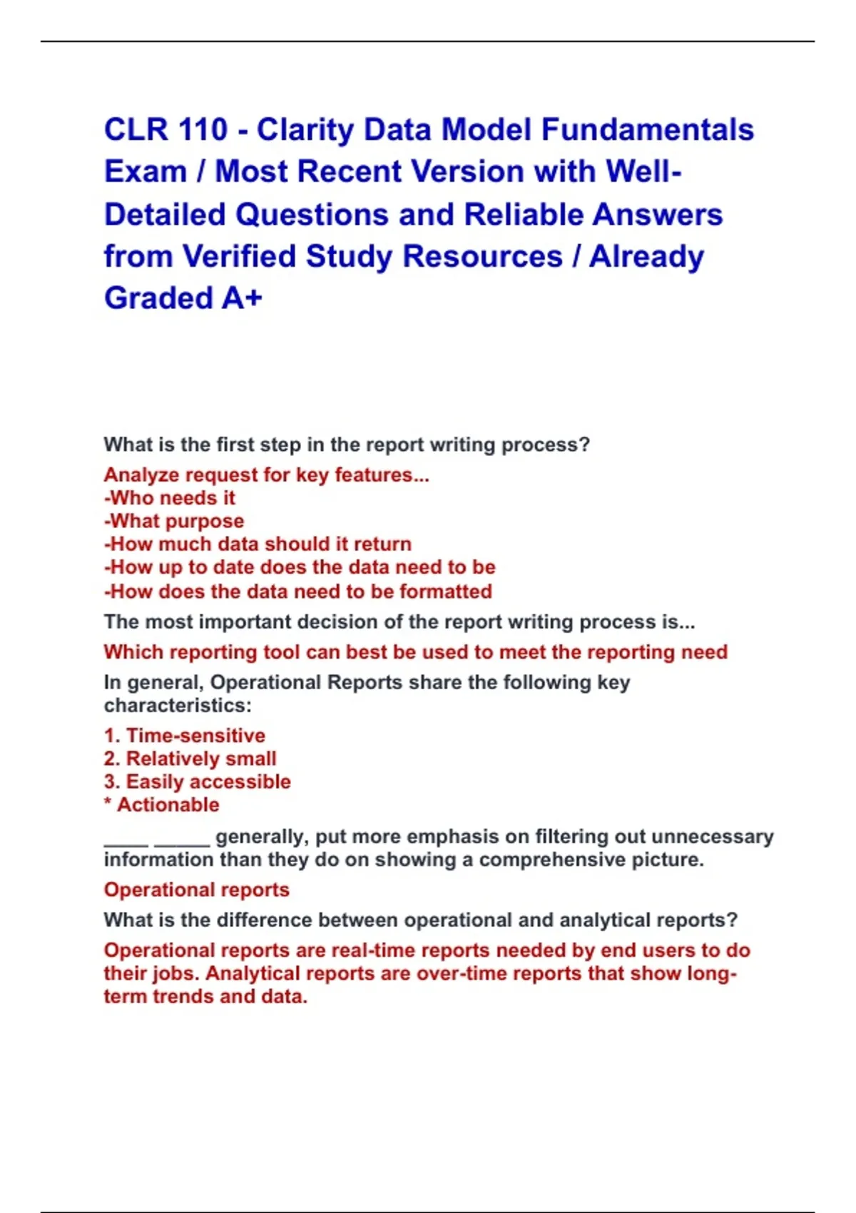 CLR 110 - Clarity Data Model Fundamentals Exam / Most Recent Version with Well-Detailed Questions and Reliable Answers from Verified Study Resources / Already Graded A+