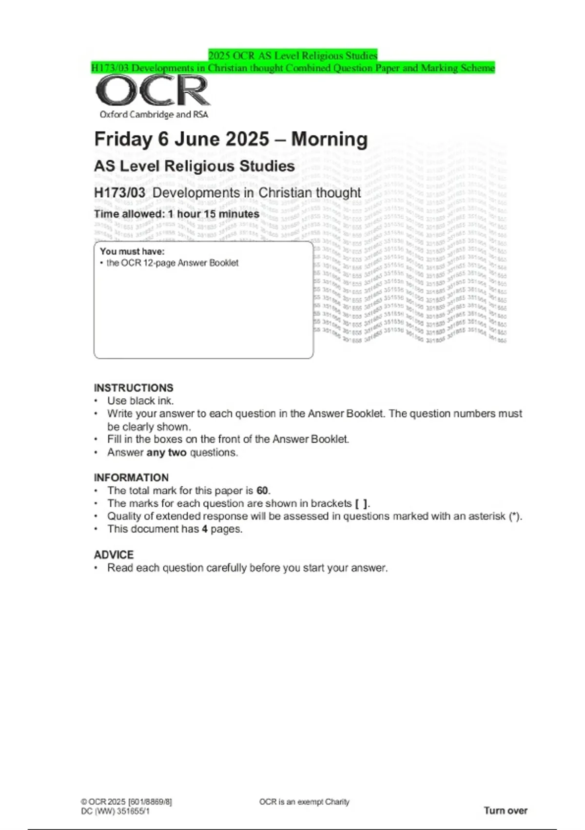 2025 OCR AS Level Religious Studies H173/03 Developments in Christian thought Combined Question Paper and Marking Scheme