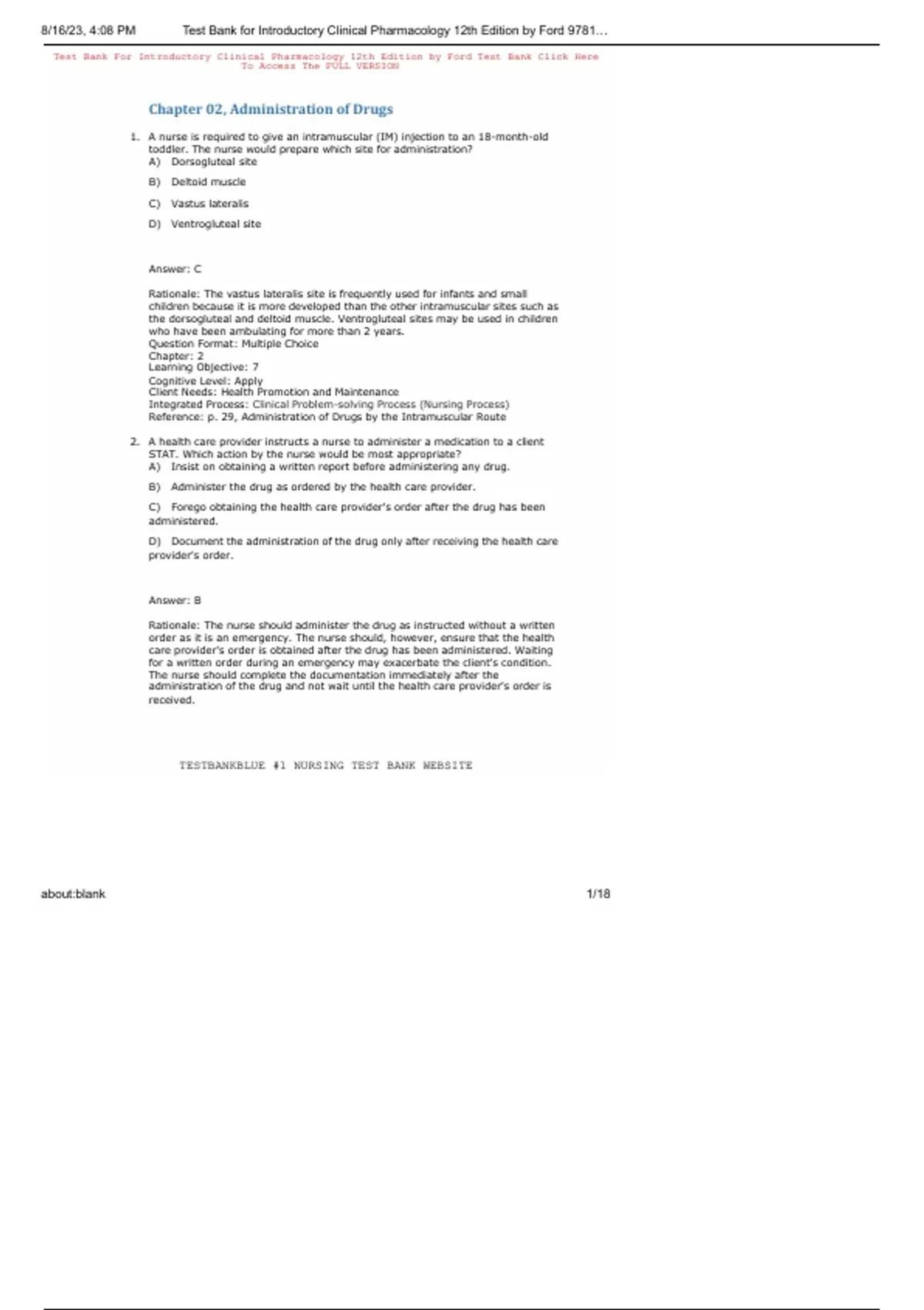 , 8/16/23, 4:08 PM Test Bank for Introductory Clinical Pharmacology 12th Edition by Ford 9781…