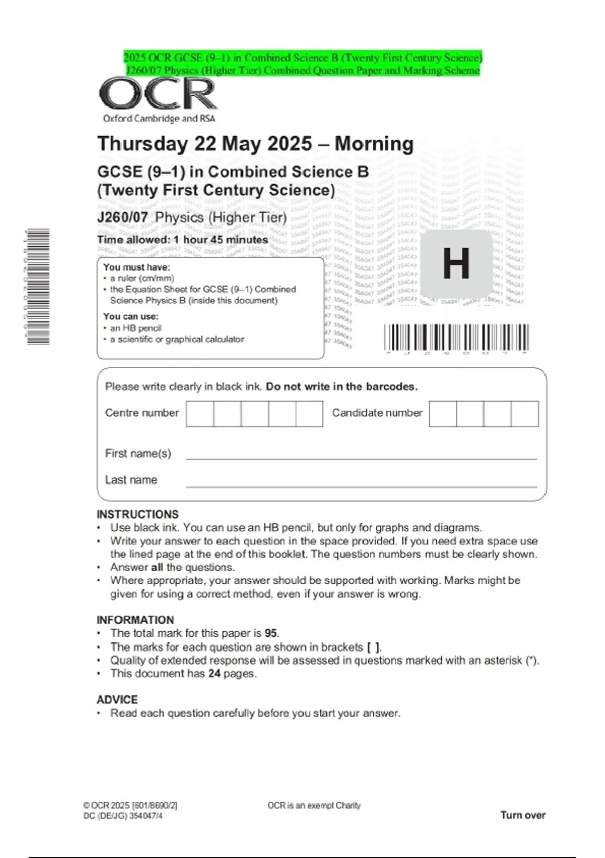 2025 OCR GCSE (9–1) in Combined Science B (Twenty First Century Science) J260/07 Physics (Higher Tier) Combined Question Paper and Marking Scheme
