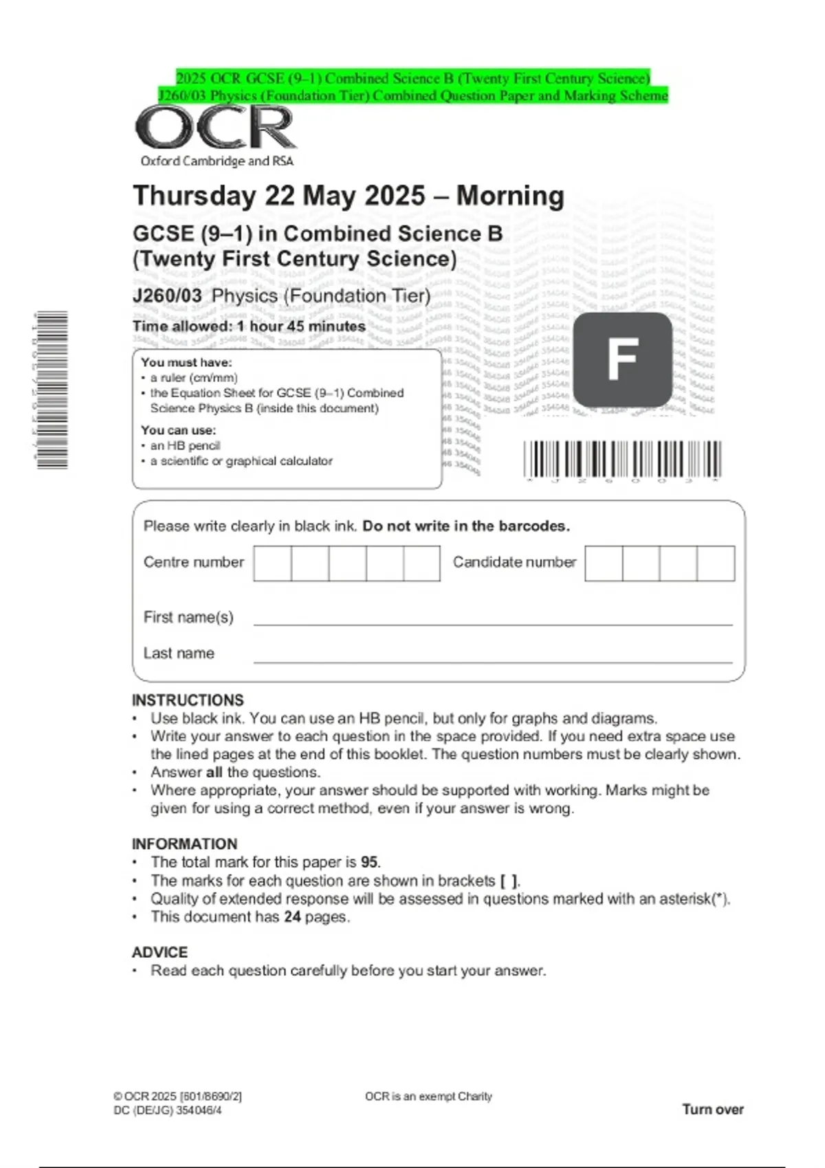 2025 OCR GCSE (9–1) Combined Science B (Twenty First Century Science) J260/03 Physics (Foundation Tier) Combined Question Paper and Marking Scheme