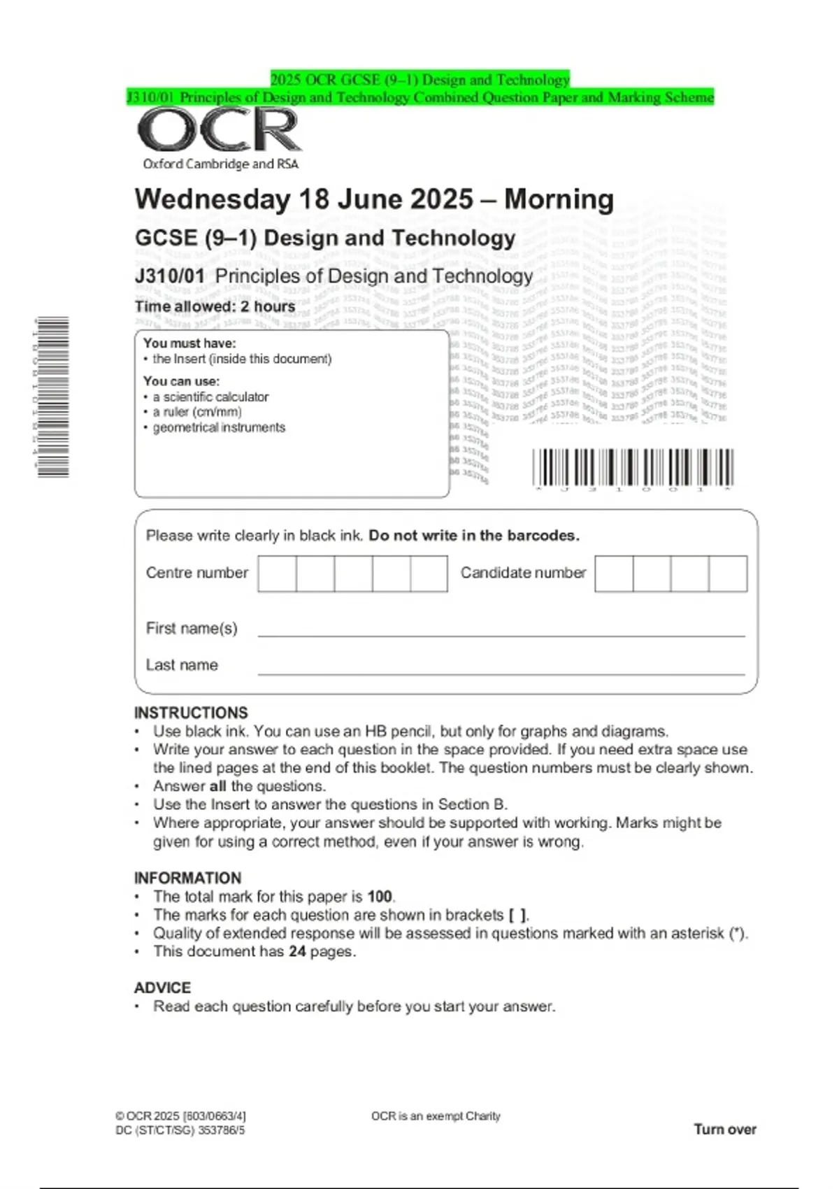 2025 OCR GCSE (9–1) Design and Technology J310/01 Principles of Design and Technology Combined Question Paper and Marking Scheme