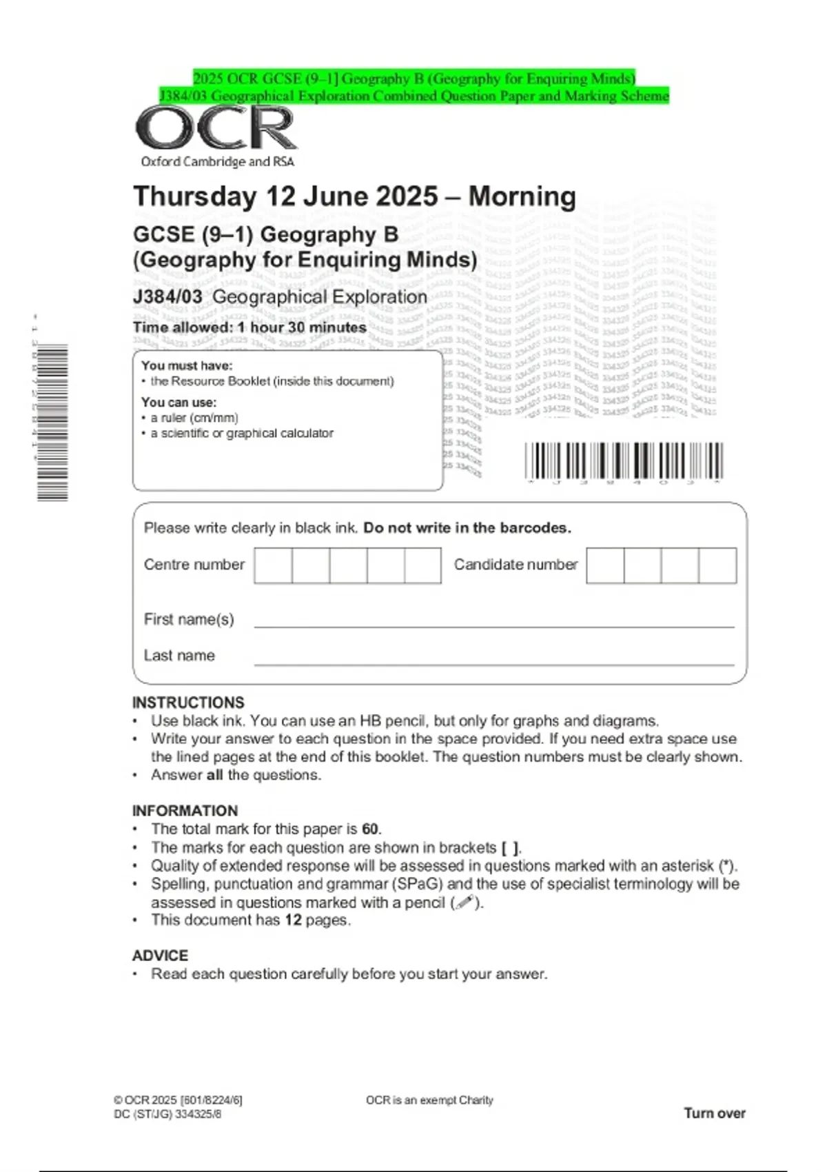 2025 OCR GCSE (9–1] Geography B (Geography for Enquiring Minds) J384/03 Geographical Exploration Combined Question Paper and Marking Scheme