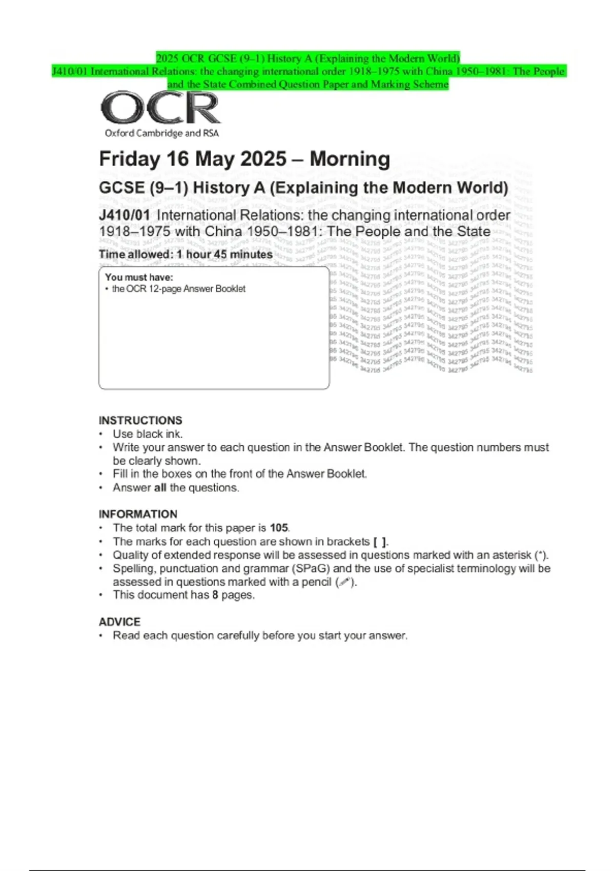 2025 OCR GCSE (9–1) History A (Explaining the Modern World) J410/01 International Relations: the changing international order 1918–1975 with China 1950–1981: The People and the State Combined Question Paper and Marking Scheme