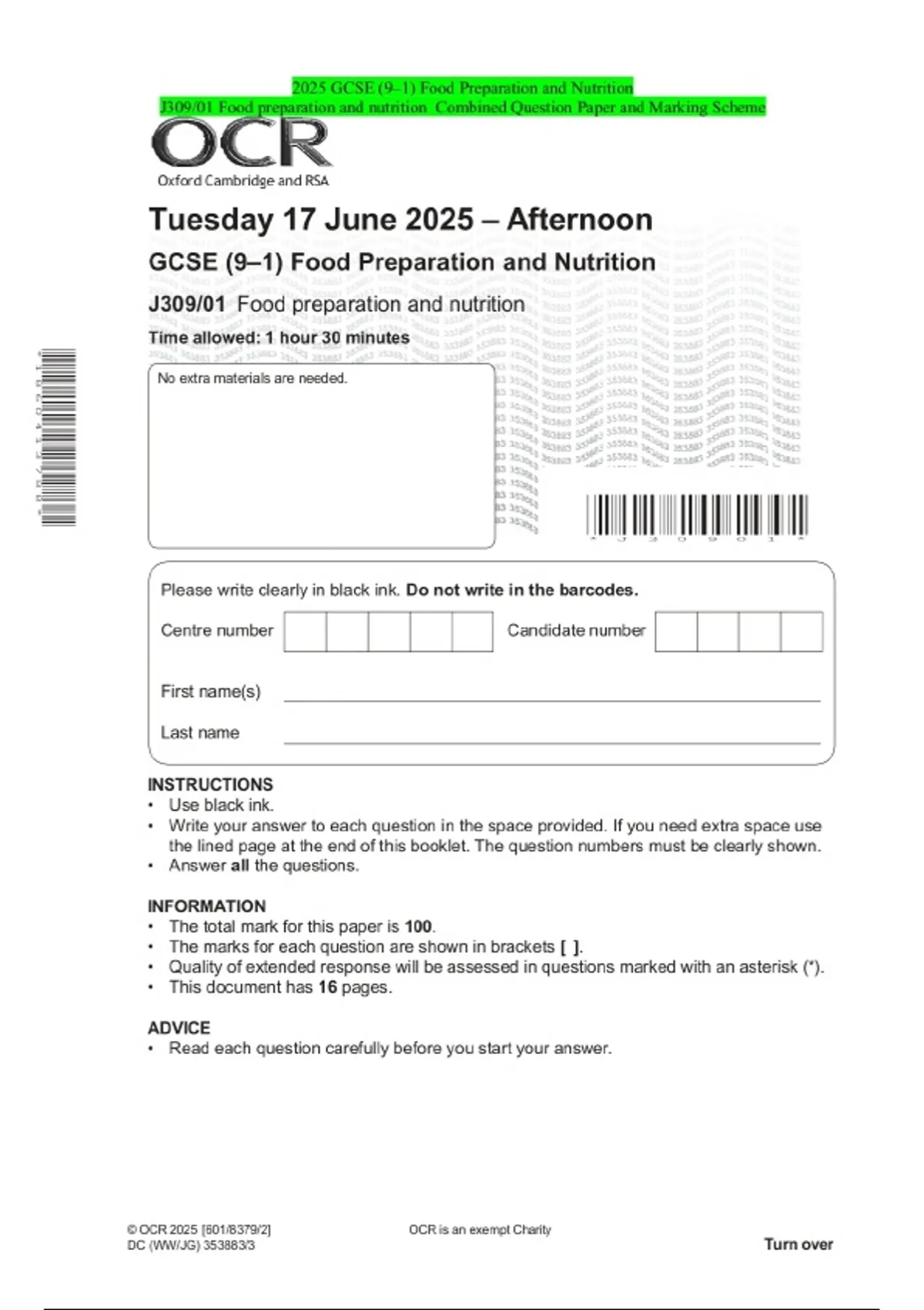 2025 GCSE (9–1) Food Preparation and Nutrition J309/01 Food preparation and nutrition Combined Question Paper and Marking Scheme