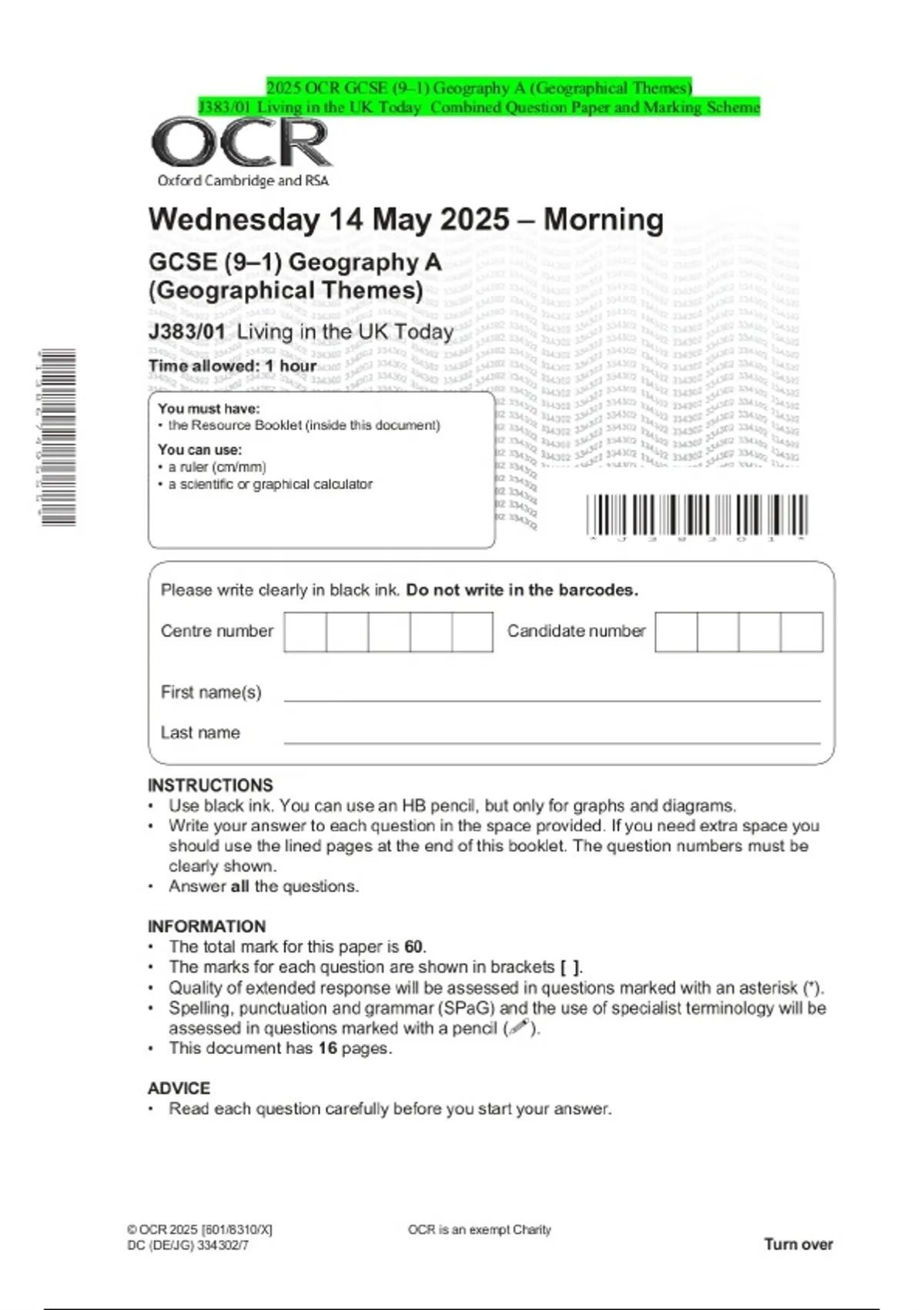 2025 OCR GCSE (9–1) Geography A (Geographical Themes) J383/01 Living in the UK Today Combined Question Paper and Marking Scheme