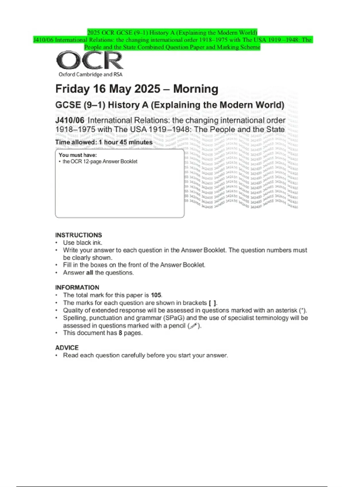 2025 OCR GCSE (9–1) History A (Explaining the Modern World) J410/06 International Relations: the changing international order 1918–1975 with The USA 1919 –1948: The People and the State Combined Question Paper and Marking Scheme