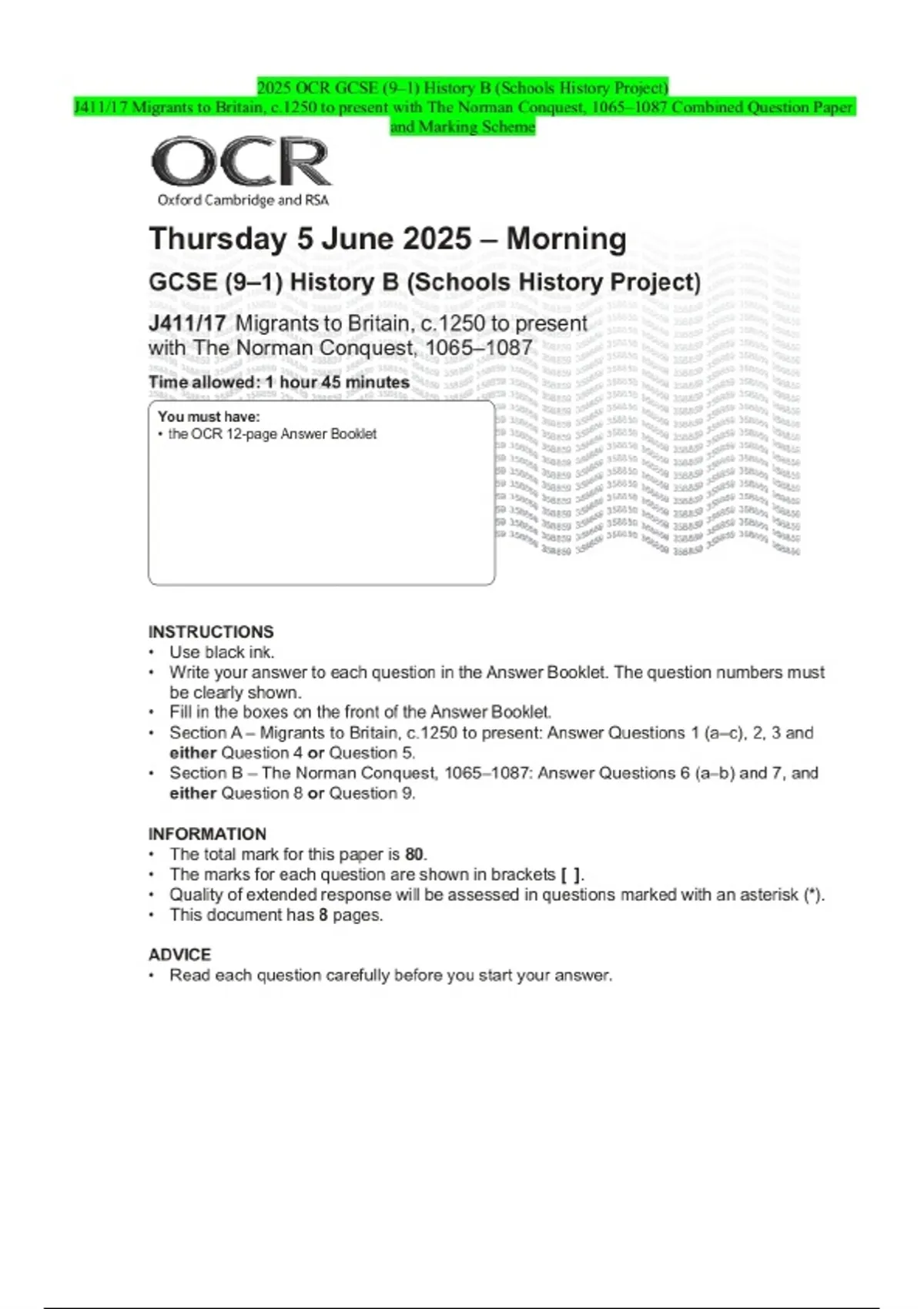 2025 OCR GCSE (9–1) History B (Schools History Project) J411/17 Migrants to Britain, c.1250 to present with The Norman Conquest, 1065–1087 Combined Question Paper and Marking Scheme