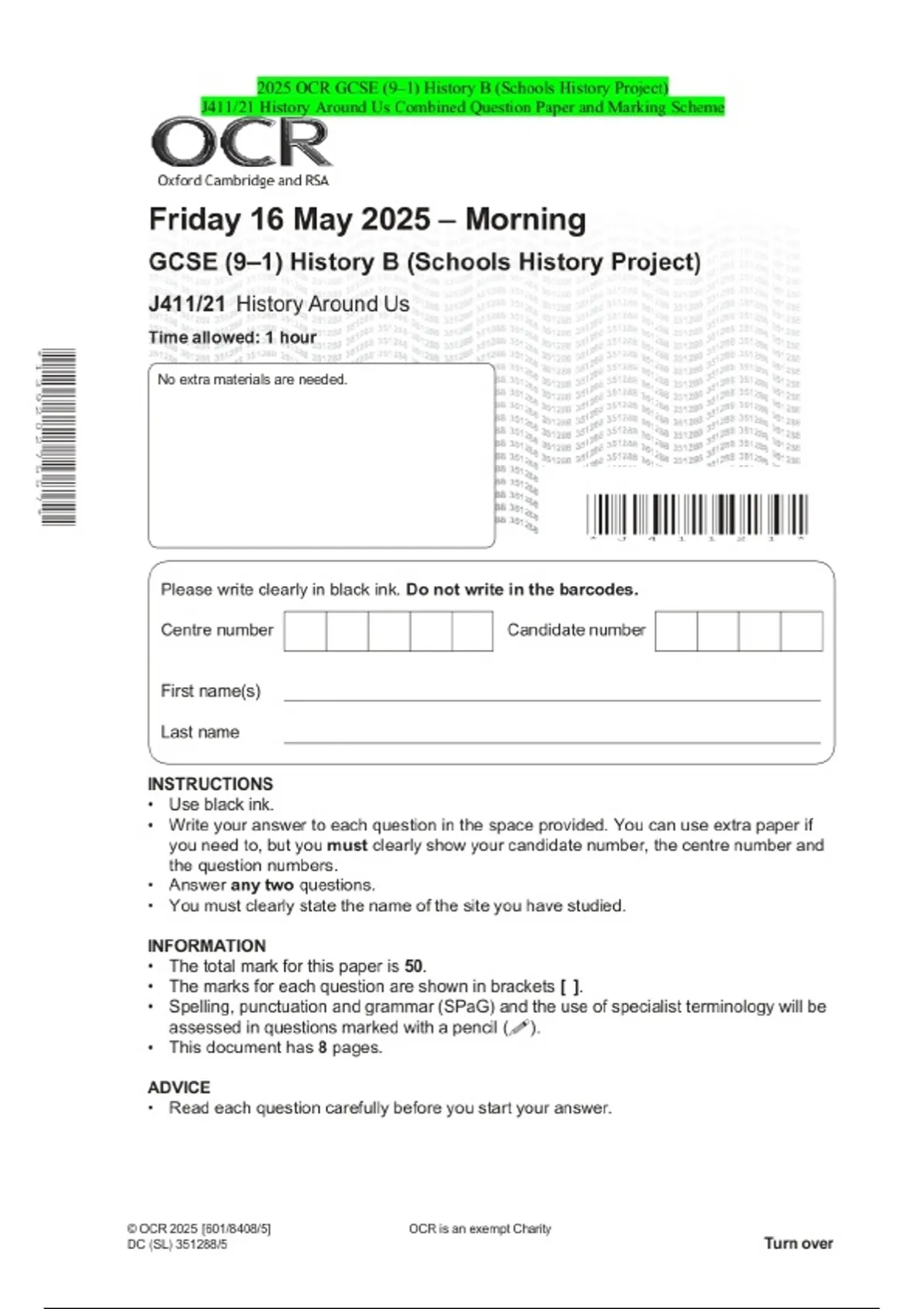 2025 OCR GCSE (9–1) History B (Schools History Project) J411/21 History Around Us Combined Question Paper and Marking Scheme