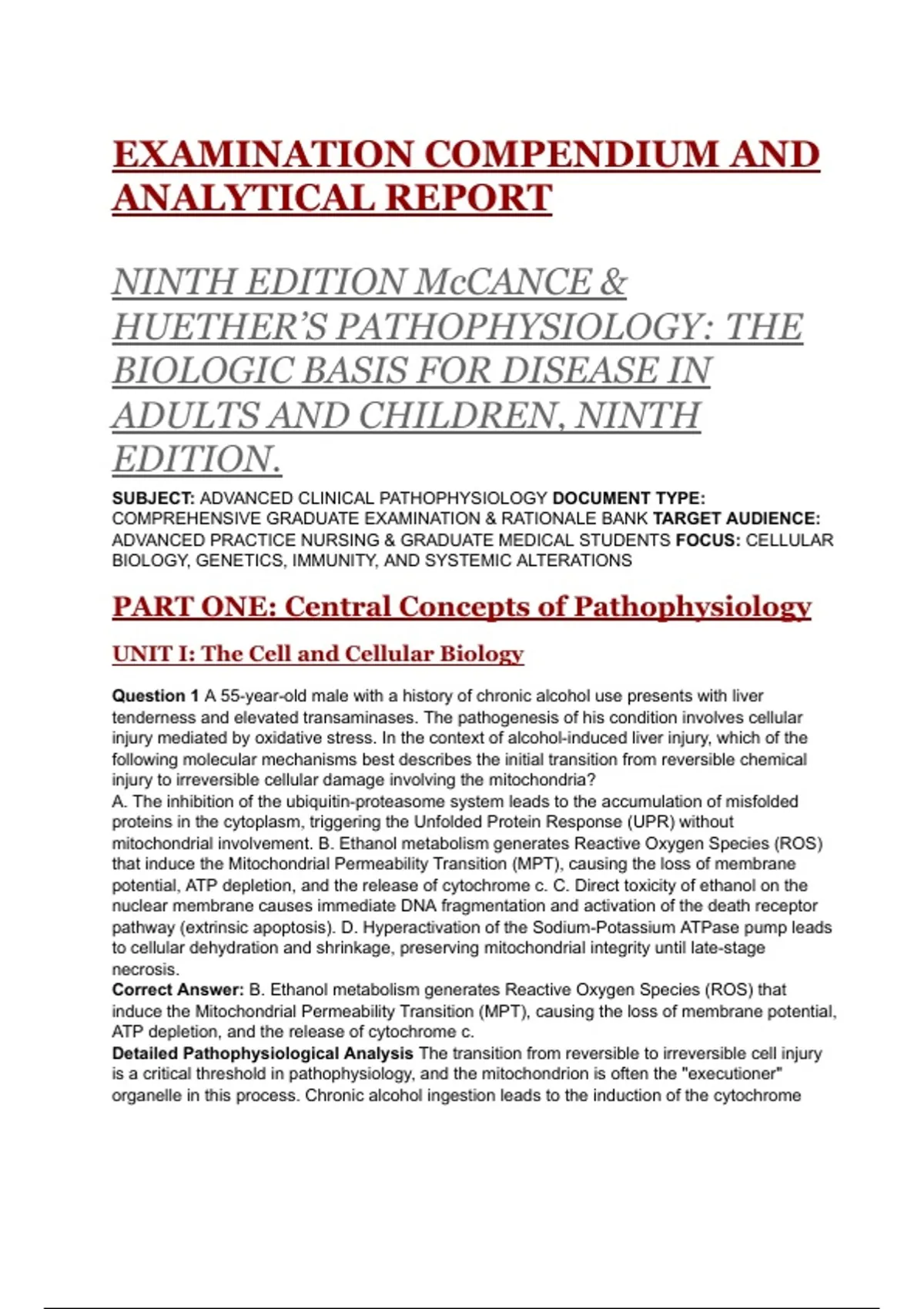 This document provides an extensive, graduate-level examination bank aligned with McCance & Huether’s Pathophysiology (9th edition). It includes detailed, mechanism-focused questions and in-depth rationales spanning cellular biology, genetics and epigenetics, immunity, inflammation, cancer biology, and major organ system disorders. The material further integrates cutting-edge molecular concepts such as necroptosis, EMT signaling, inflammasome activation, metabolic reprogramming, and neurodegenerative mechanisms. The exam functions as a complete, analytic compendium designed for advanced practice nursing and medical students, ideal for coursework, assessment creation, and board-level preparation.