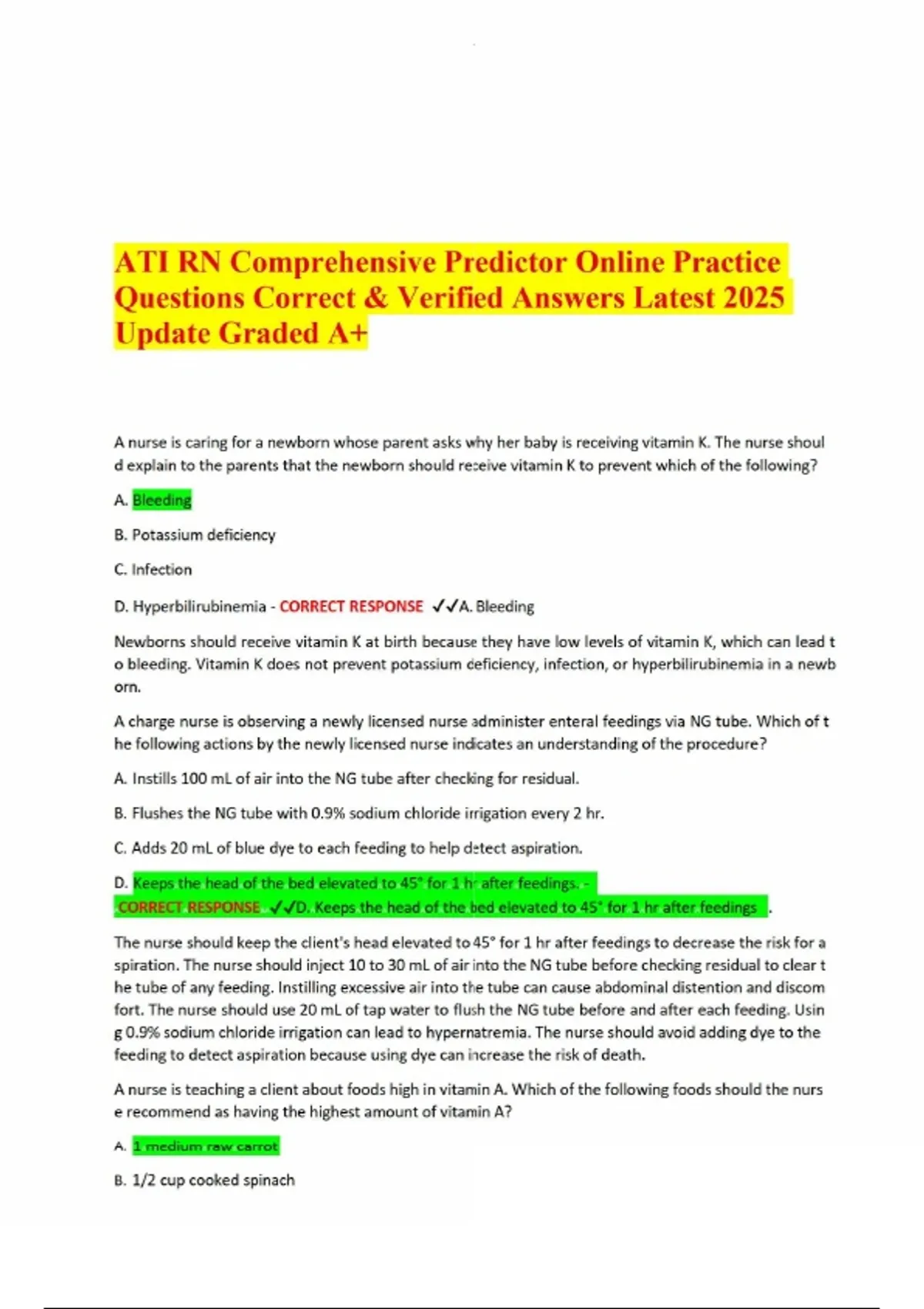 ATI RN Comprehensive Predictor Online Practice Questions Correct & Verified Answers Latest 2025 Update Graded A+ Complete practice resource for the ATI RN Comprehensive Predictor Exam — featuring the latest 2025 update with correct and verified answers. Content Coverage: - Newborn Care: - Vitamin K administration at birth → prevents bleeding due to low vitamin K levels. - Enteral Feeding via NG Tube: - Correct procedure: elevate head to 45° post‑feeding, flush with tap water, avoid dye. - Nutrition & Vitamins: - Foods high in vitamin A → carrots provide the highest amount compared to spinach, squash, or cantaloupe. - Delegation of Care: - RN delegates NG tube insertion to LPN; AP collects stool specimens and prepares postoperative beds; RN administers packed RBCs. - Informed Consent: - Client must accurately describe the procedure to demonstrate understanding before signing consent. - Total Parenteral Nutrition (TPN): - If infusion pump fails, infuse Dextrose 10% in water manually at the same rate to prevent hypoglycemia. - Mental Health: - Chlorpromazine adverse effect → priority finding is high temperature (neuroleptic malignant syndrome). Features: - Latest 2025 update included - Correct and verified answers with rationales - Grade A+ content for nursing exam prep - Covers ATI RN Predictor Exam practice, NCLEX review, and clinical scenarios - Saves hours of study time with concise explanations