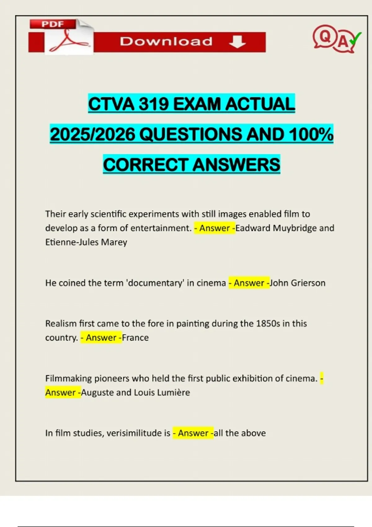 CTVA 319 EXAM ACTUAL 2025/2026 QUESTIONS AND 100% CORRECT ANSWERS Their early scientific experiments with still images enabled film to develop as a form of entertainment. - Answer -Eadward Muybridge and Etienne-Jules Marey He coined the term 'documentary' in cinema - Answer -John Grierson Realism first came to the fore in painting during the 1850s in this country. - Answer -France