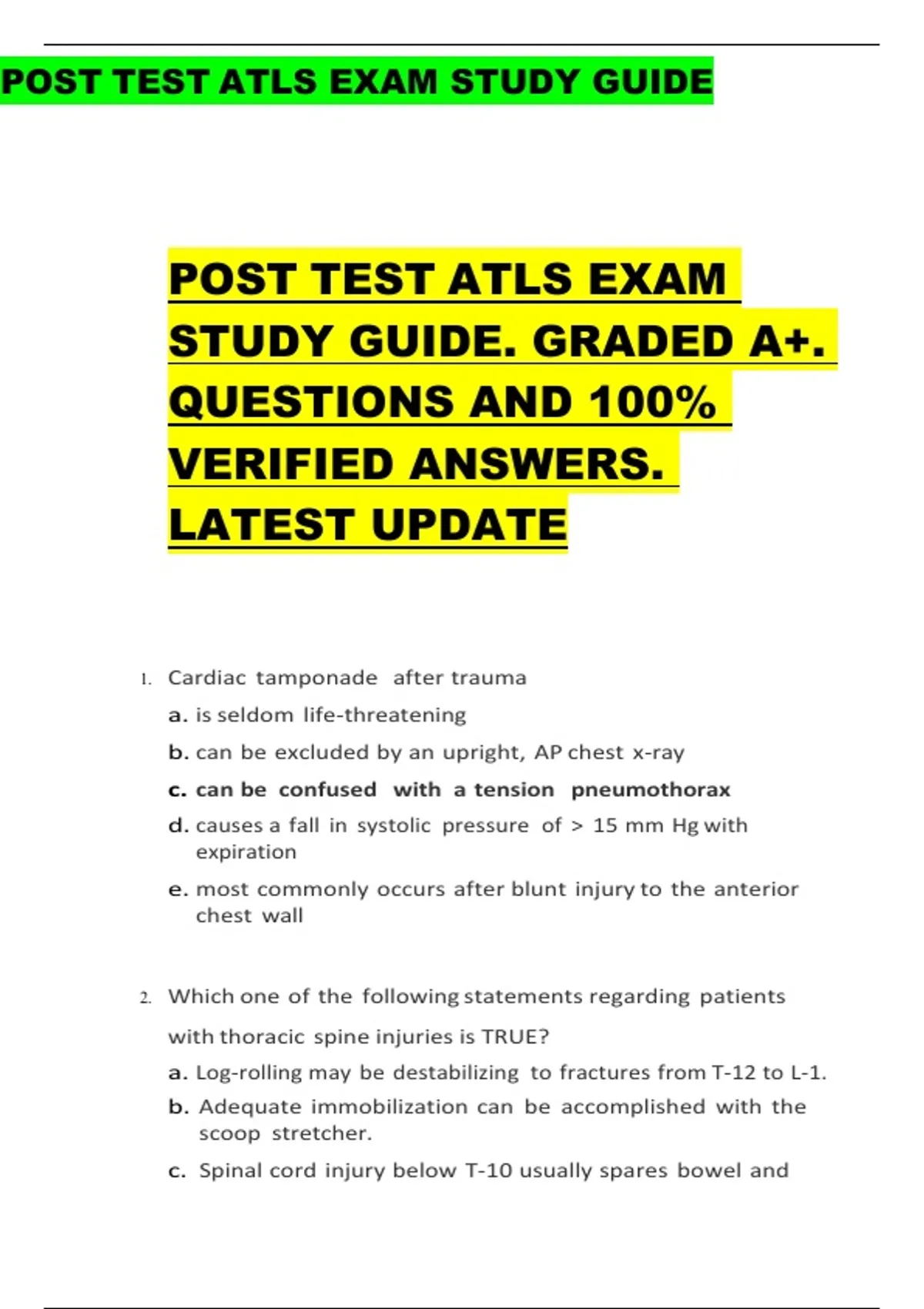 POST TEST ATLS EXAM STUDY GUIDE POST TEST ATLS EXAM STUDY GUIDE. GRADED A+. QUESTIONS AND 100% VERIFIED ANSWERS. LATEST UPDATE