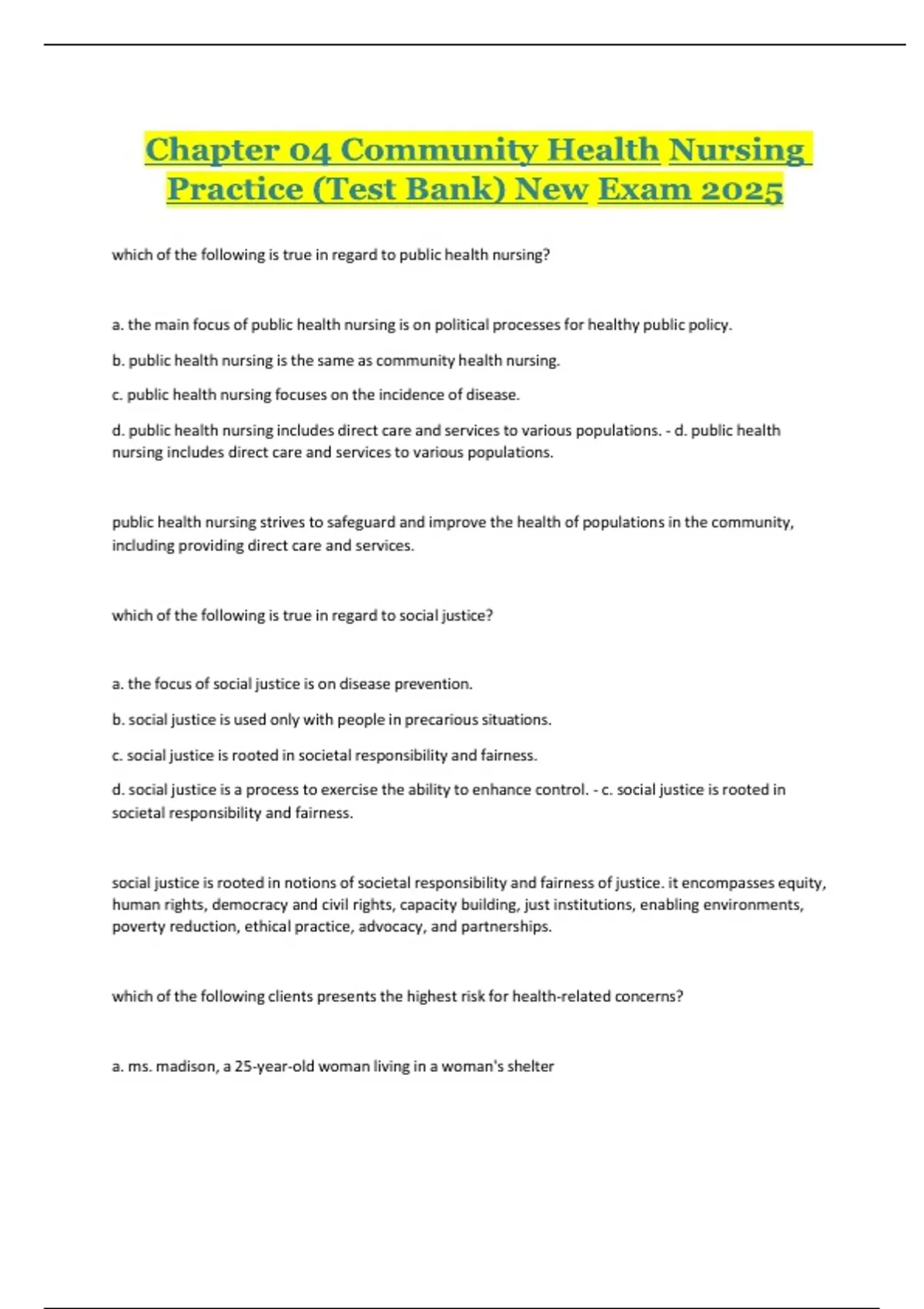 d. public health nursing includes direct care and services to various populations. - d. public health