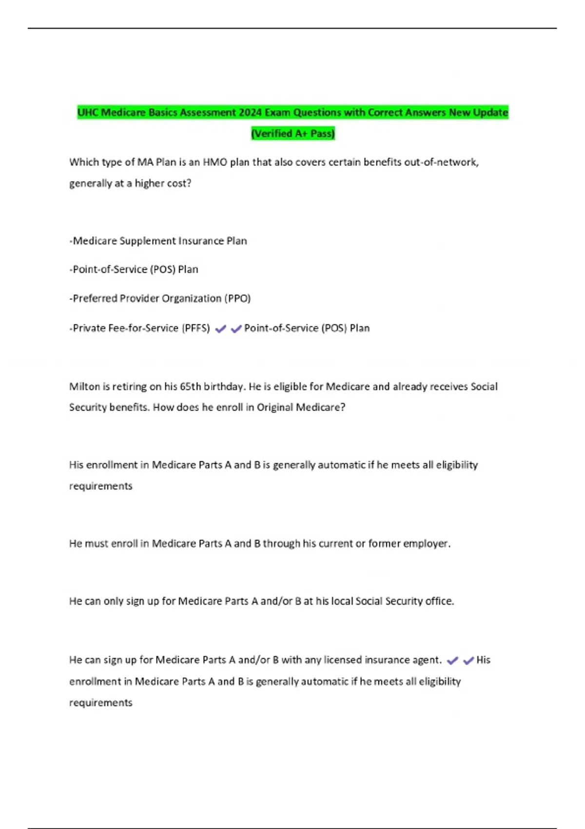 UHC Medicare Basics Assessment 2024 Exam Questions with Correct Answers New Update (Verified A+ Pass)
