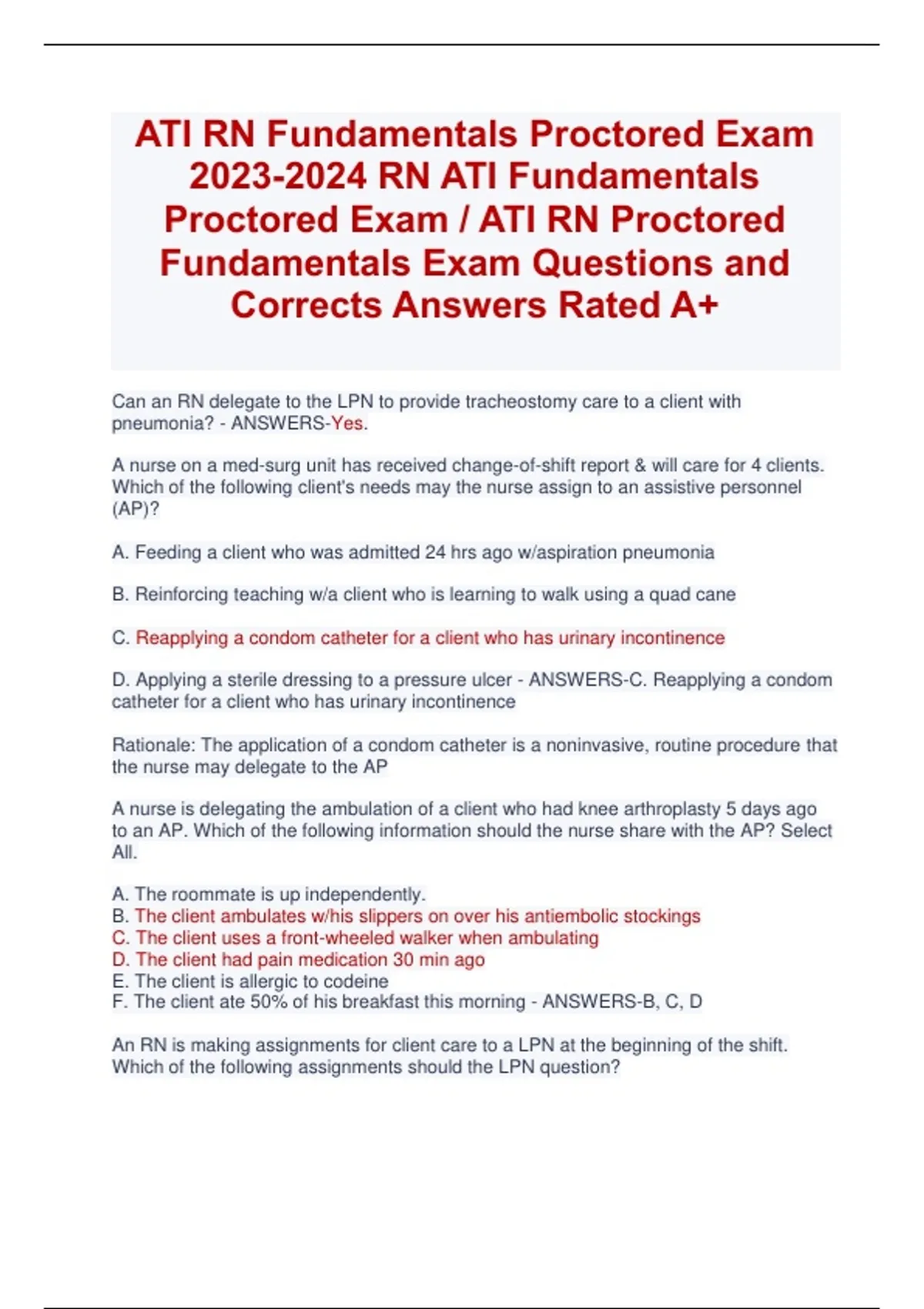 This document covers the full set of ATI RN Fundamentals Proctored Exam questions and correct answers for the 2026–2027 testing cycle. It includes updated, exam-style items aligned with ATI’s Fundamentals framework, focusing on basic nursing skills, safety, infection control, mobility, client education, and foundational nursing concepts. The material is designed to support comprehensive preparation for proctored assessments and mirrors the structure and difficulty of the official exam.