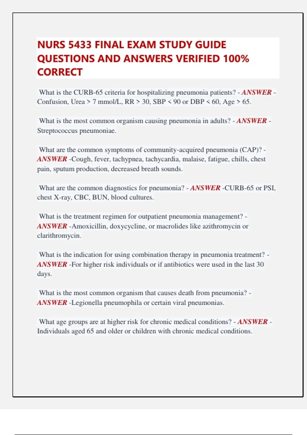 NURS 5433 FINAL EXAM STUDY GUIDE QUESTIONS AND ANSWERS VERIFIED 100% CORRECT What is the CURB-65 criteria for hospitalizing pneumonia patients? - ANSWER Confusion, Urea > 7 mmol/L, RR > 30, SBP < 90 or DBP < 60, Age > 65. What is the most common organism causing pneumonia in adults? - ANSWER Streptococcus pneumoniae. What are the common symptoms of community-acquired pneumonia (CAP)? - ANSWER -Cough, fever, tachypnea, tachycardia, malaise, fatigue, chills, chest pain, sputum production, decreased breath sounds. What are the common diagnostics for pneumonia? - ANSWER -CURB-65 or PSI, chest X-ray, CBC, BUN, blood cultures. What is the treatment regimen for outpatient pneumonia management? - ANSWER -Amoxicillin, doxycycline, or macrolides like azithromycin or clarithromycin. What is the indication for using combination therapy in pneumonia treatment? - ANSWER -For higher risk individuals or if antibiotics were used in the last 30 days. What is the most common organism that causes death from pneumonia? - ANSWER -Legionella pneumophila or certain viral pneumonias. What age groups are at higher risk for chronic medical conditions? - ANSWER Individuals aged 65 and older or children with chronic medical conditions. What are some chronic medical conditions that increase risk for infectious diseases? - ANSWER -Chronic heart, lung (asthma, COPD), kidney, liver disease, diabetes, cancer, and immunosuppression (e.g., HIV). What are the gram-positive bacteria that should be known? - ANSWER Streptococcus, Staphylococcus, and Enterococcus. What class of antibiotics is effective against gram-positive and gram-negative bacteria? - ANSWER -Cephalosporins, with effectiveness varying by generation. What are the characteristics of penicillins? - ANSWER -Effective against both gram-positive and gram-negative bacteria. Which antibiotics are known to treat anaerobes and pseudomonas? - ANSWER Carbapenems. What types of infections are tetracyclines used to treat? - ANSWER -Infections caused by protozoa, spirochetes, mycobacteria, and chlamydia. What are the live vaccines that should not be given to immunocompromised individuals? - ANSWER -Measles, mumps, rubella (MMR), Varicella, Flu mist, Rotavirus, and OPV (polio). What is the recommended management for Kawasaki disease? - ANSWER Supportive care, detection of coronary artery disease, anti-inflammatory treatment, and consultation with a cardiologist. What are the diagnostic criteria for Kawasaki disease? - ANSWER -Fever for 5 days, CBC showing left shift and mild anemia, elevated ESR and CRP, and sterile pyuria. What is the presentation of influenza in adults? - ANSWER -Fever, malaise, myalgia, headache, anorexia, rhinitis, sore throat, and non-productive cough. What are the complications associated with influenza? - ANSWER -Pneumonia, sinusitis, otitis media, myositis, pericarditis, and exacerbation of pre-existing conditions. What is the causative agent of Fifth Disease? - ANSWER -Human parvovirus B19. What is the characteristic rash associated with Fifth Disease? - ANSWER -A bright, erythematous rash on cheeks and forehead, often described as a 'slapped cheek' appearance. What are the symptoms of Lyme Disease in Stage 1? - ANSWER -Erythema migrans (bull's eye rash), fever, malaise, headache, and neck stiffness. What is the hallmark rash of Rocky Mountain Spotted Fever? - ANSWER -A maculopapular rash that starts on palms and soles and becomes petechial. What diagnostic tests are used for Lyme Disease? - ANSWER -Enzyme immunoassay (EIA), immunofluorescence assay (IFA), and Western immunoblot for antibodies. What should be done if a tick is found on a patient? - ANSWER -Remove the tick carefully and monitor for symptoms of tick-borne diseases. What is the management for immunocompromised patients with Fifth Disease? - ANSWER -Blood transfusions and IV immunoglobulin (IVIG). What is the recommended vaccination for pregnant women? - ANSWER -All pregnant women should receive the flu vaccine and Tdap with each pregnancy after 20 weeks. What is the significance of the MMR vaccine in relation to autism? - ANSWER MMR vaccine is not associated with autism.