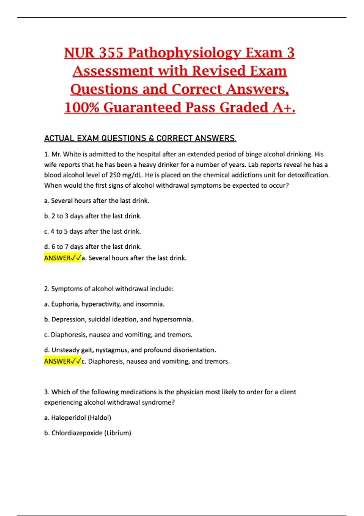 This document provides the revised Exam 3 assessment questions for NUR 355 Pathophysiology along with the correct answers. It covers advanced pathophysiological concepts, multi-system disorders, and the clinical manifestations emphasized in the third portion of the course. The material is organized to support efficient, exam-focused preparation and aligns with the structure and expectations of typical NUR 355 assessments.This document provides the revised Exam 3 assessment questions for NUR 355 Pathophysiology along with the correct answers. It covers advanced pathophysiological concepts, multi-system disorders, and the clinical manifestations emphasized in the third portion of the course. The material is organized to support efficient, exam-focused preparation and aligns with the structure and expectations of typical NUR 355 assessments.This document provides the revised Exam 3 assessment questions for NUR 355 Pathophysiology along with the correct answers. It covers advanced pathophysiological concepts, multi-system disorders, and the clinical manifestations emphasized in the third portion of the course. The material is organized to support efficient, exam-focused preparation and aligns with the structure and expectations of typical NUR 355 assessments.