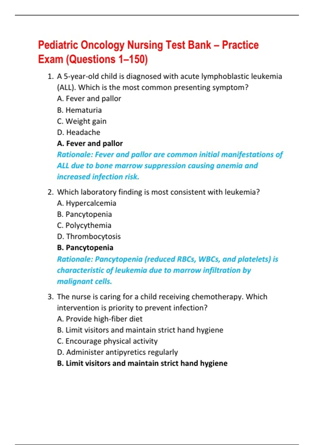 Pediatric Oncology Nursing Test Bank – Practice