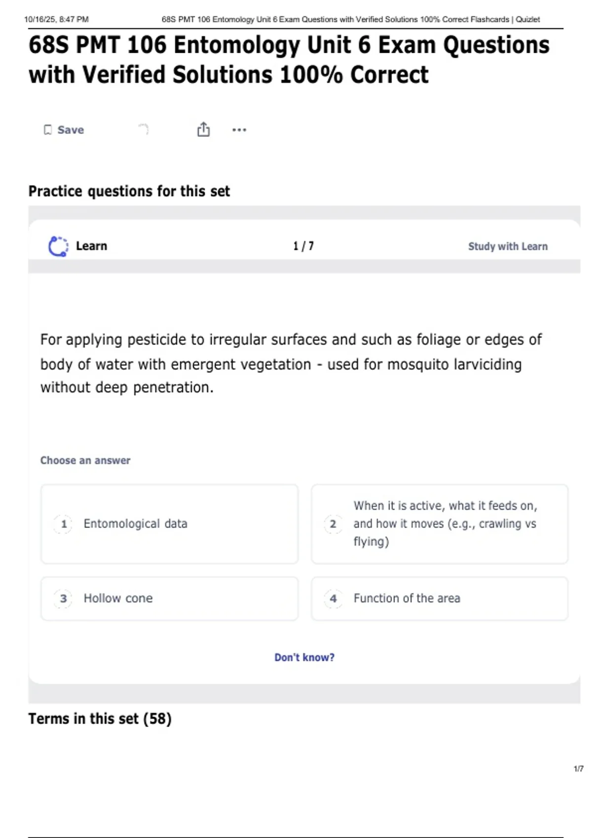 , 10/16/25, 8:47 PM 68S PMT 106 Entomology Unit 6 Exam Questions with Verified Solutions 100% Correct Flashcards | Quizlet