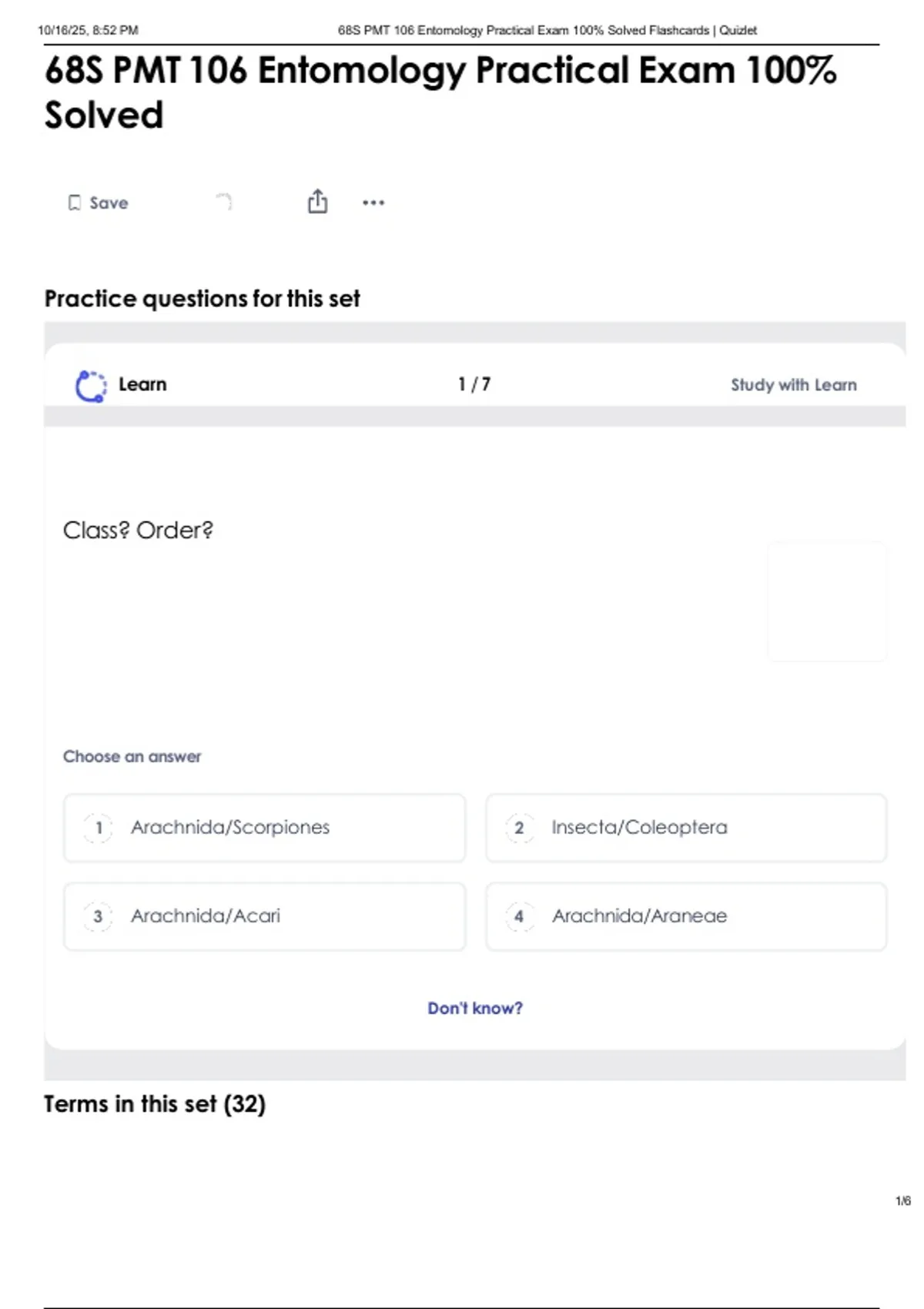 , 10/16/25, 8:52 PM 68S PMT 106 Entomology Practical Exam 100% Solved Flashcards | Quizlet