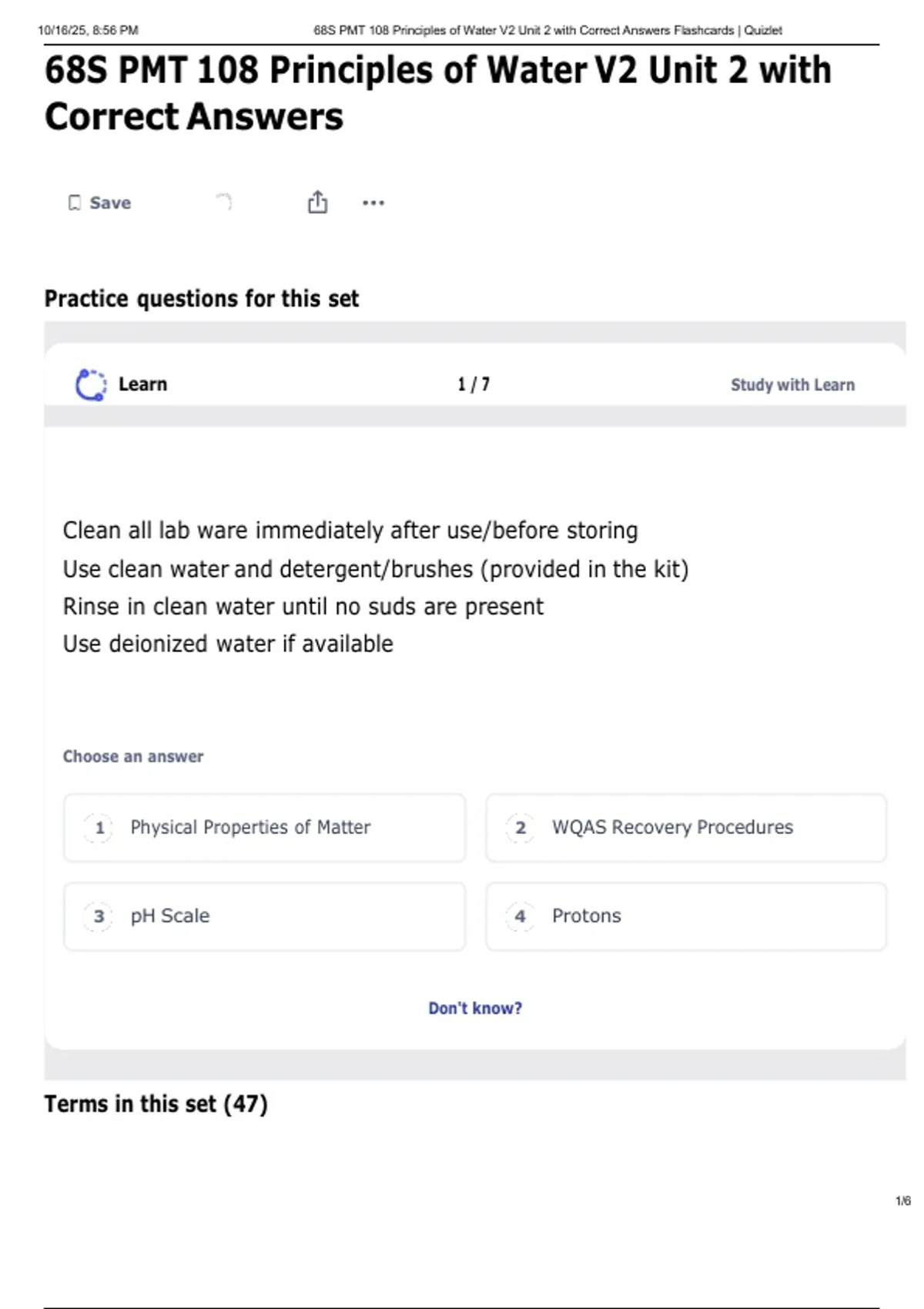 , 10/16/25, 8:56 PM 68S PMT 108 Principles of Water V2 Unit 2 with Correct Answers Flashcards | Quizlet