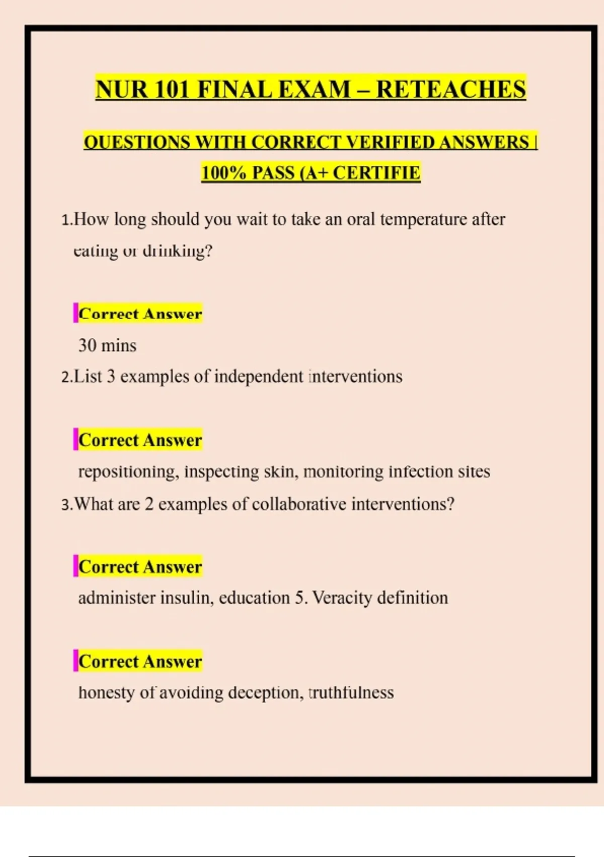 NUR 101 FINAL EXAM – RETEACHES QUESTIONS WITH CORRECT VERIFIED ANSWERS | 100% PASS (A+ CERTIFIE 1. How long should you wait to take an oral temperature after eating or drinking? Correct Answer 30 mins 2. List 3 examples of independent interventions Correct Answer repositioning, inspecting skin, monitoring infection sites 3. What are 2 examples of collaborative interventions? Correct Answer administer insulin, education 5. Veracity definition Correct Answer honesty of avoiding deception, truthfulness 6. A nurse is caring for a client with a confirmed Tuberculosis (TB) diagnosis. Which of the following are the most appropriate nursing intervention(s)? Select all that apply. a. Don a surgical mask prior to entering the client's room b. Ensure that the client is in a negative pressure room c. If the client leaves their room, ensure that the client dons a surgical mask d. Instruct the client to never leave their room e. Maintain standard precautions Correct Answer b, c 7. A nurse is caring for a client with a possible vector-borne transmitted microorganism. Which of the following are vector borne modes of transmission? Select all that apply. a. Contaminated needles b. Bats c. Sneezing d. Water ingestion e. Urinary catheter Correct Answer a, b, e 8. List the 6 medication administration rights Correct Answer right patient, time, dose, medication, route, documentation 9. Is the right room or right place considered a medication administration right? Correct Answer no 10. What occurs in the pre interactional phase? Correct Answer feelings about the client - age, diagnosis, cultural considerations, previous interactions