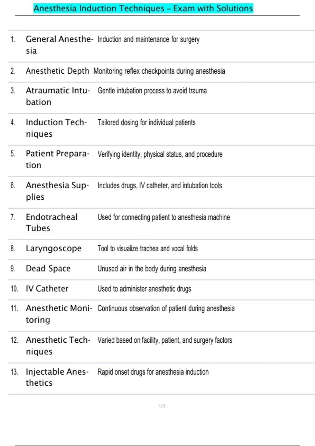 Anesthesia Induction Techniques – Exam with Solutions