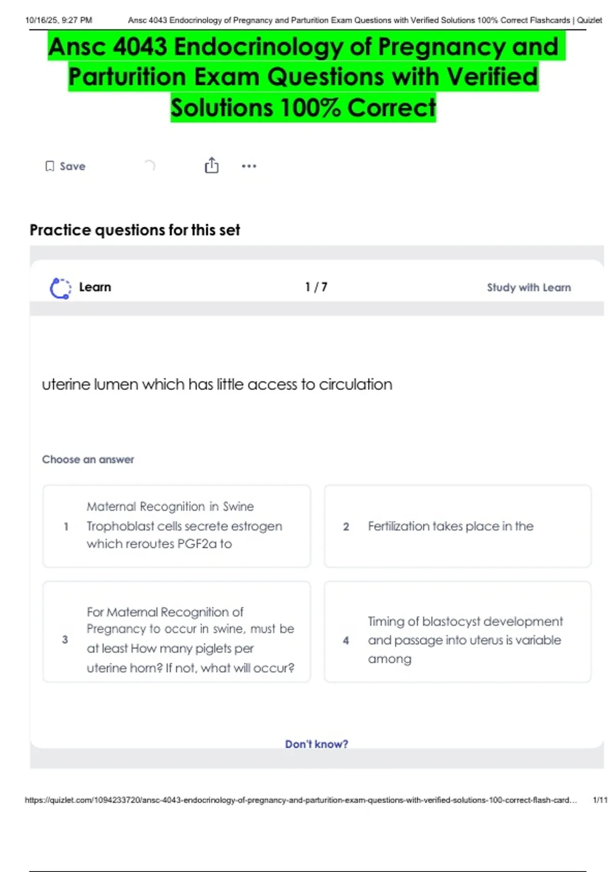 10/16/25, 9:27 PM Ansc 4043 Endocrinology of Pregnancy and Parturition Exam Questions with Verified Solutions 100% Correct Flashcards | Quizlet