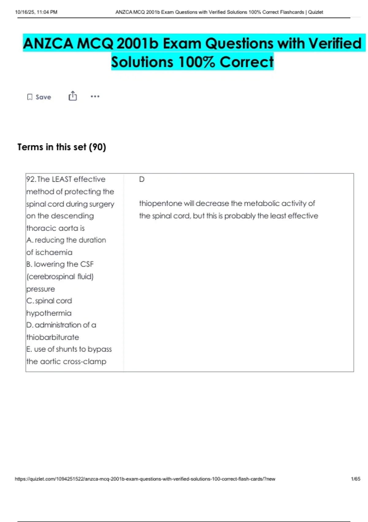 , 10/16/25, 11:04 PM ANZCA MCQ 2001b Exam Questions with Verified Solutions 100% Correct Flashcards | Quizlet