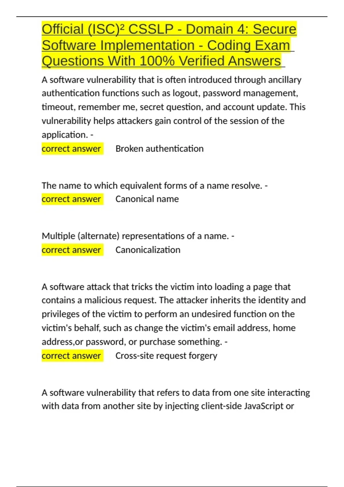Official (ISC)² CSSLP - Domain 4 Secure Software Implementation - Coding Exam Questions With 100- Verified Answers.docx