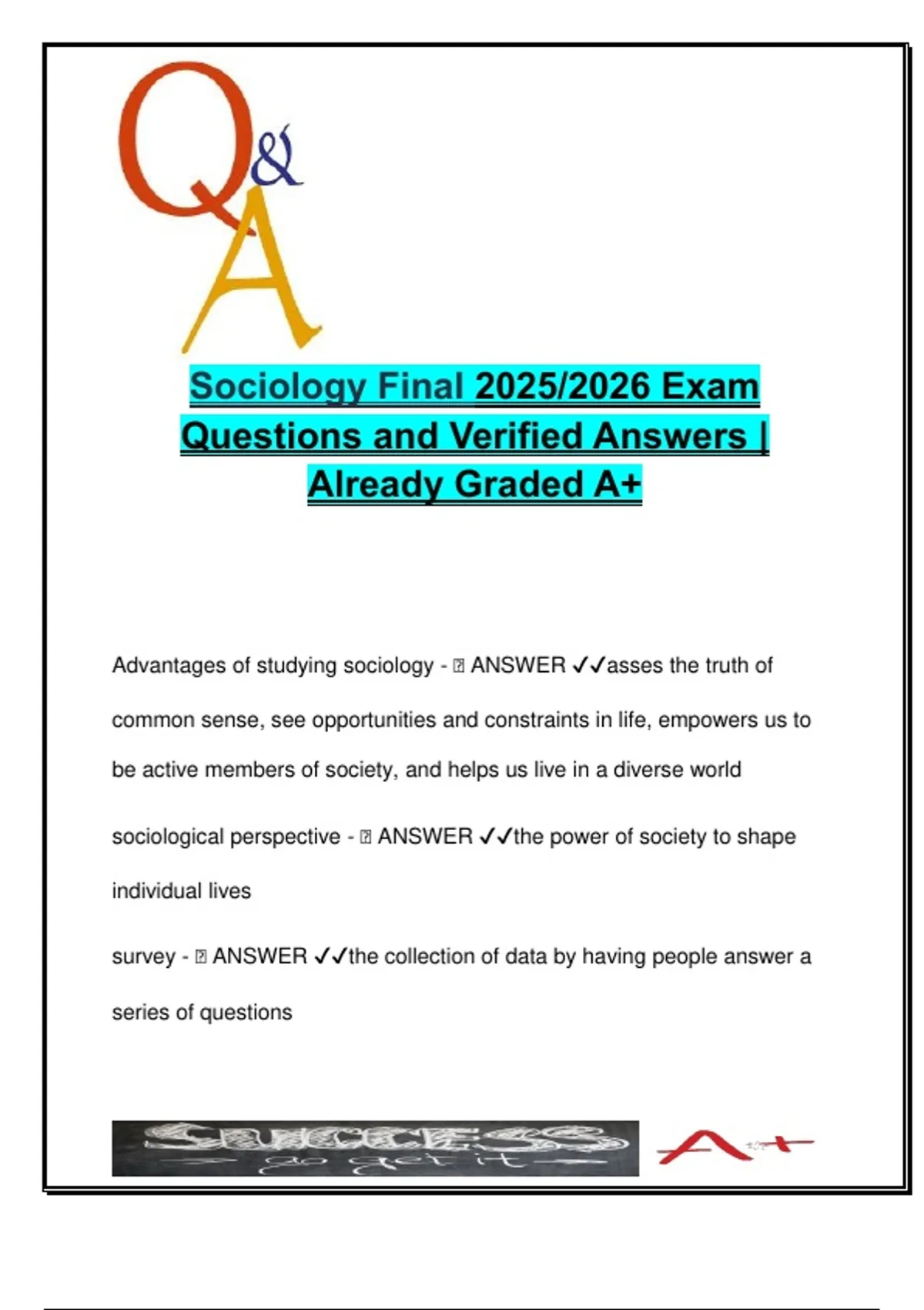 This document includes over 100 accurately answered and already graded A+ questions from the SOCI 1301 (Introduction to Sociology) Final Exam for the 2025/2026 academic year. It provides a comprehensive review of essential sociological topics and is ideal for students preparing for final assessments or requiring a high-quality summary of major concepts in sociology. The file begins with sociological research methods (surveys, experiments, variables, correlations, objectivity, replication, validity) and logic (inductive/deductive), then shifts into core theory and thinkers such as Peter Berger, C. Wright Mills, and Karl Marx. Students will review social structure, social functions, dysfunctions, manifest and latent functions, and symbolic interactionism. Subsequent sections cover culture, norms, values, socialization, deviance, and stratification, with applied topics such as gender roles, race and ethnicity, discrimination, wealth inequality, and global poverty. Environmental sociology is explored through concepts like sustainability, fossil fuels, acid rain, ocean acidification, and population growth (including Malthusian theory and demographic transition). The document also reviews key sociological terms such as Gemeinschaft vs. Gesellschaft, mechanical vs. organic solidarity, relative vs. absolute poverty, and covers classic theories including structural functionalism, conflict theory, modernization, and dependency theory. This is a well-rounded and insightful resource for students in sociology, criminology, political science, and social work. Keywords: soci 1301, sociological methods, hawthorne effect, correlation, validity, symbolic interactionism, peter berger, c. wright mills, social structure, culture, socialization, mores, norms, race, gender roles, wealth inequality, prejudice, environmental sociology, malthus, acid rain, global warming, modernization theory, dependency theory, Gemeinschaft, Gesellschaft, relative poverty