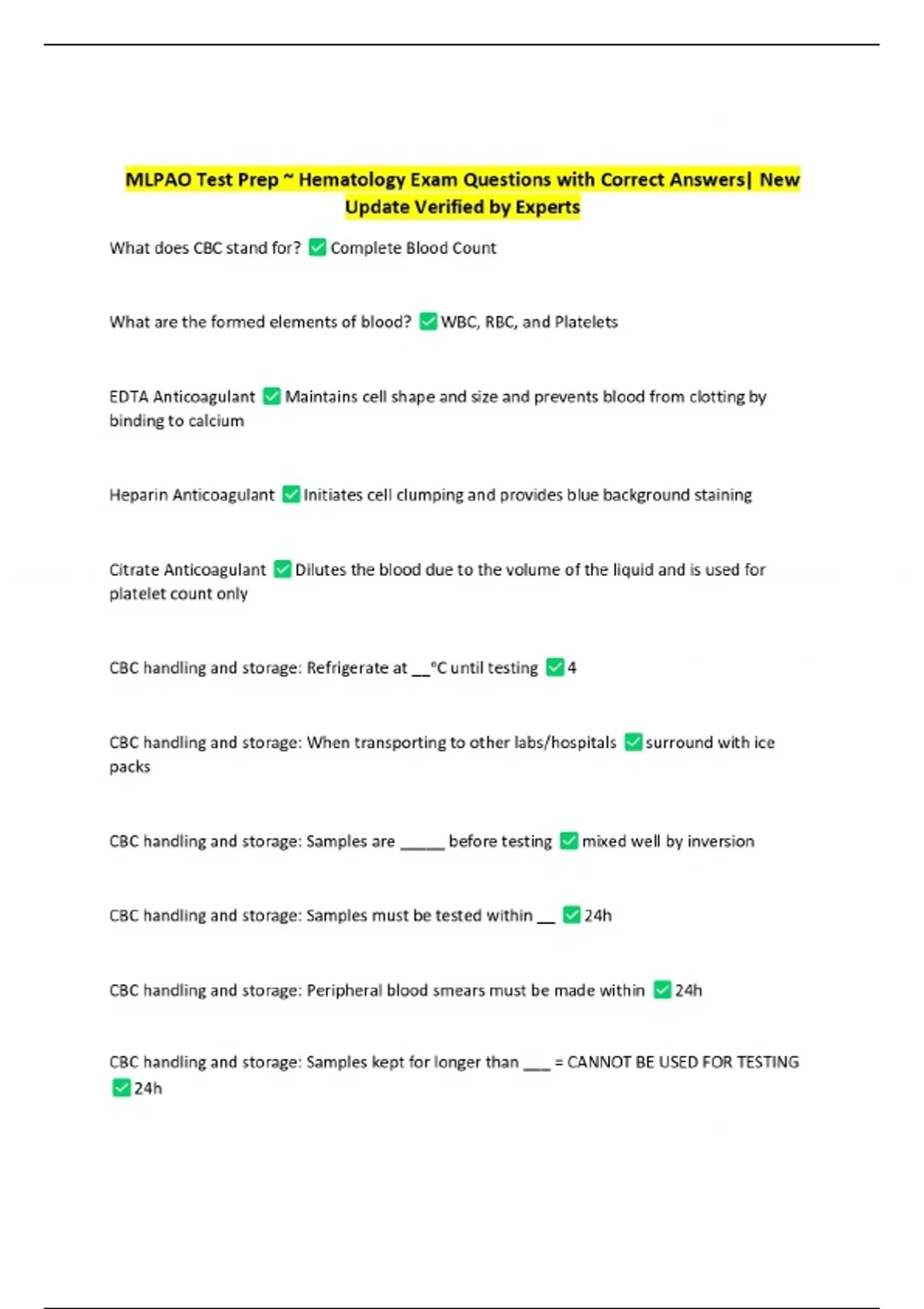 MLPAO Test Prep ~ Hematology Exam Questions with Correct Answers| New Update Verified by Experts