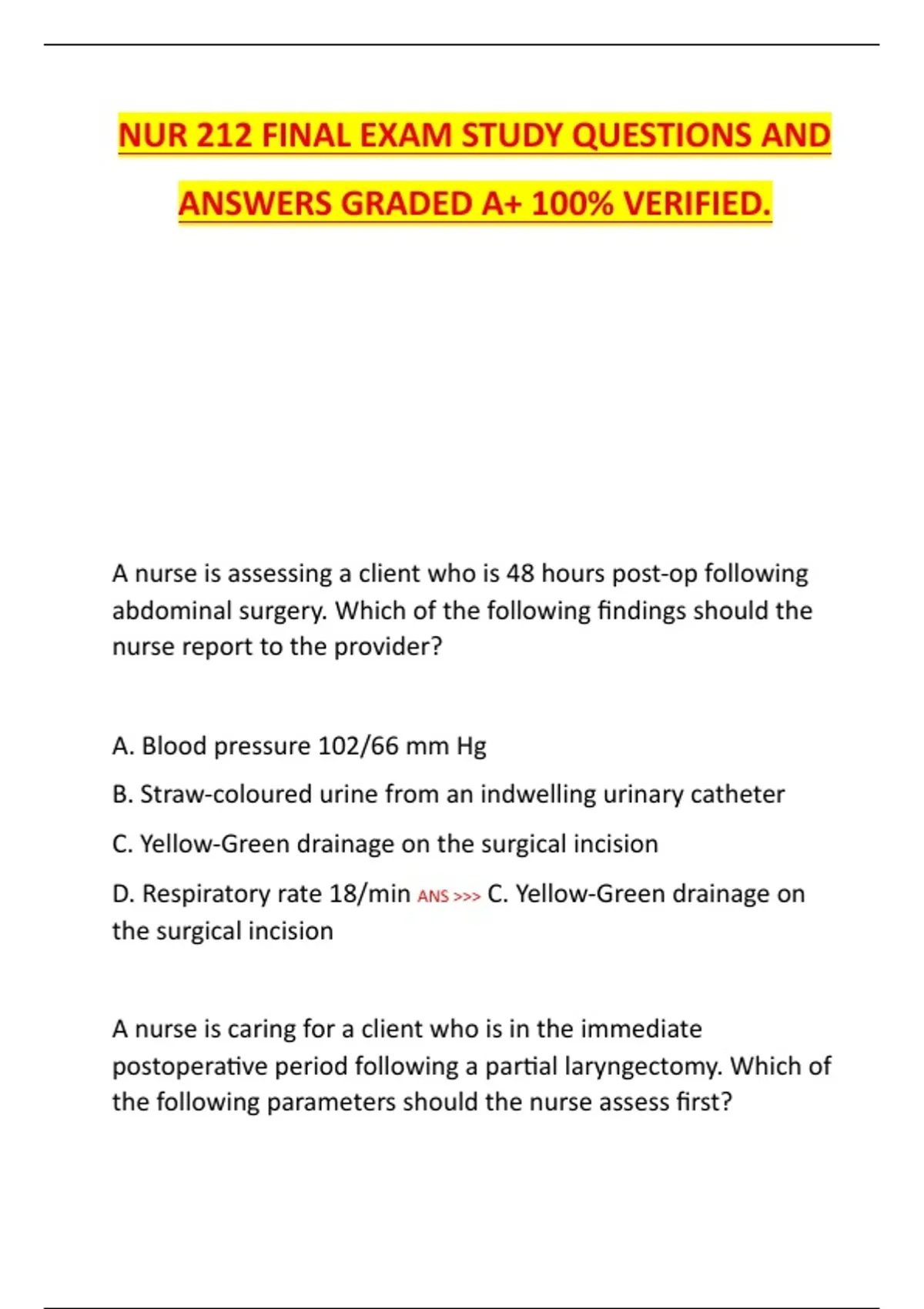 This document contains a fully verified set of NUR 212 final exam study questions and answers, covering all essential nursing topics including patient care, pharmacology, health assessment, clinical decision-making, and nursing interventions. The material is up-to-date and structured to provide comprehensive support for successful final exam preparation.