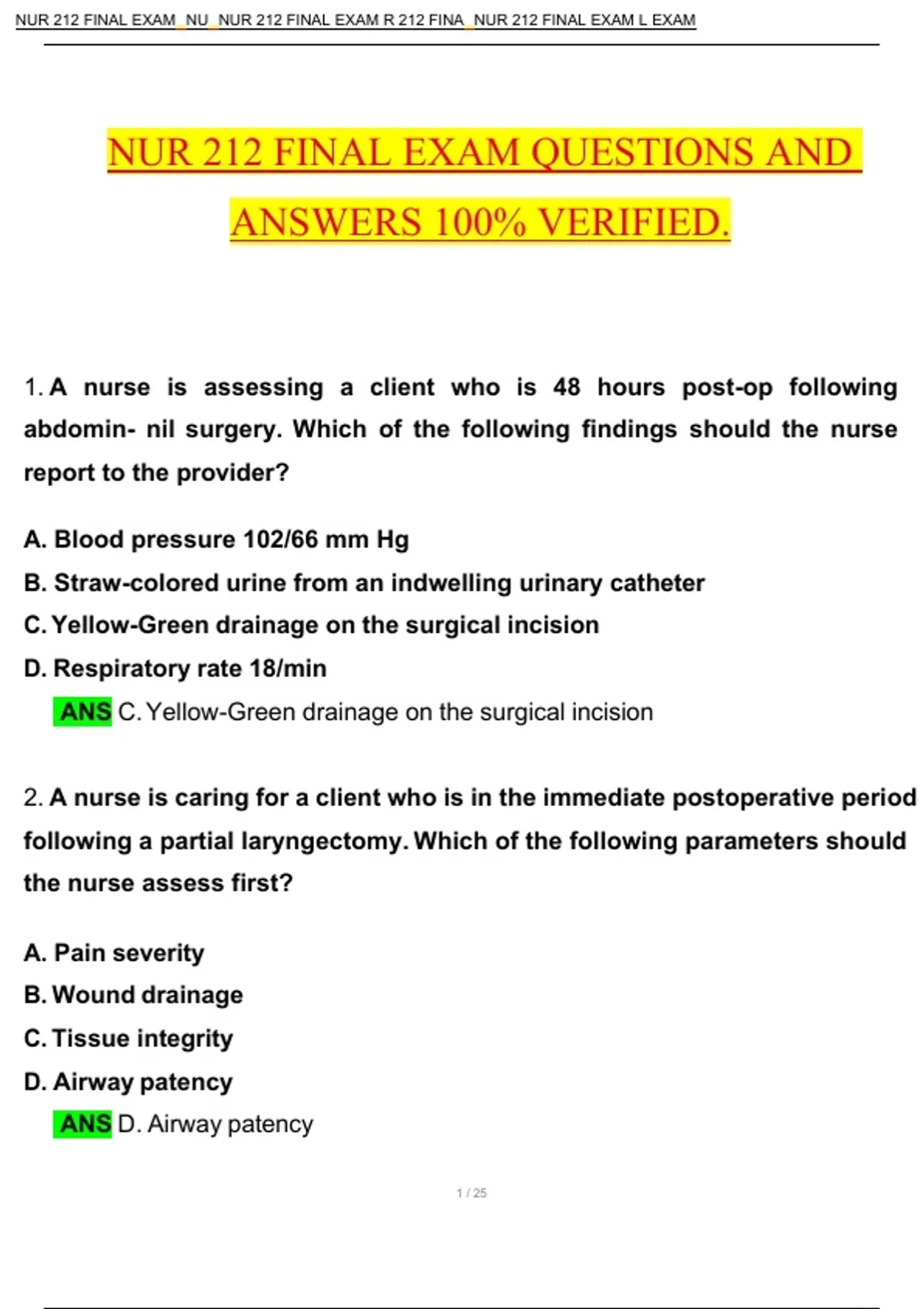 NUR 212 FINAL EXAM QUESTIONS AND