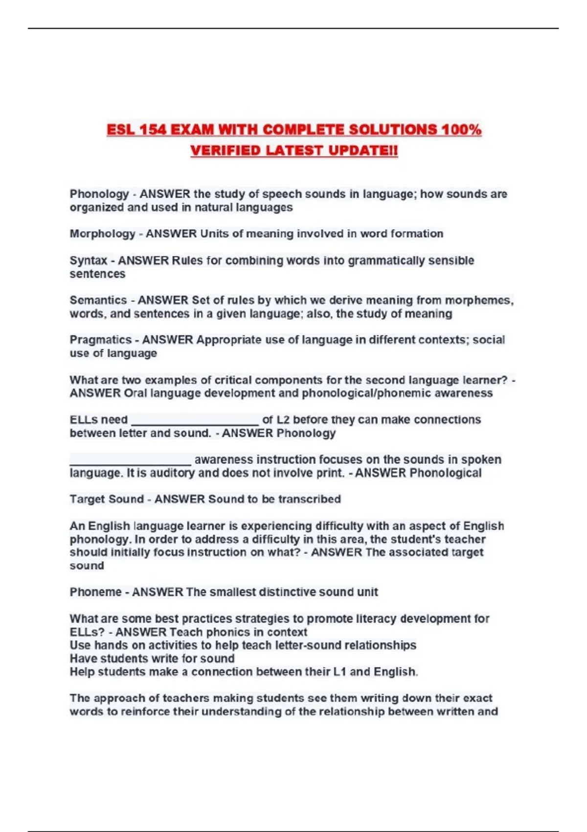 ESL 154 EXAM WITH COMPLETE SOLUTIONS 100% VERIFIED LATEST UPDATE!!...