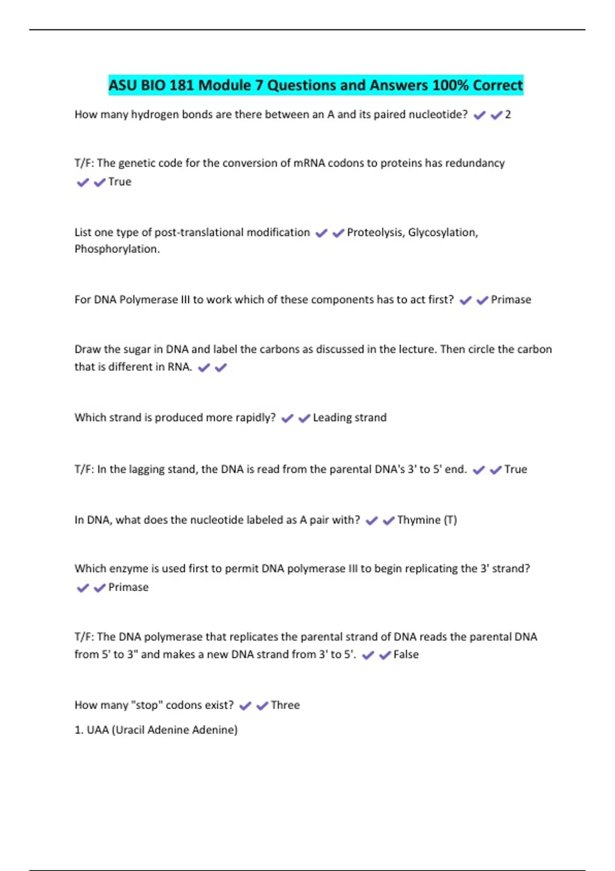 ASU BIO 181 Module 7 Questions and Answers 100% Correct