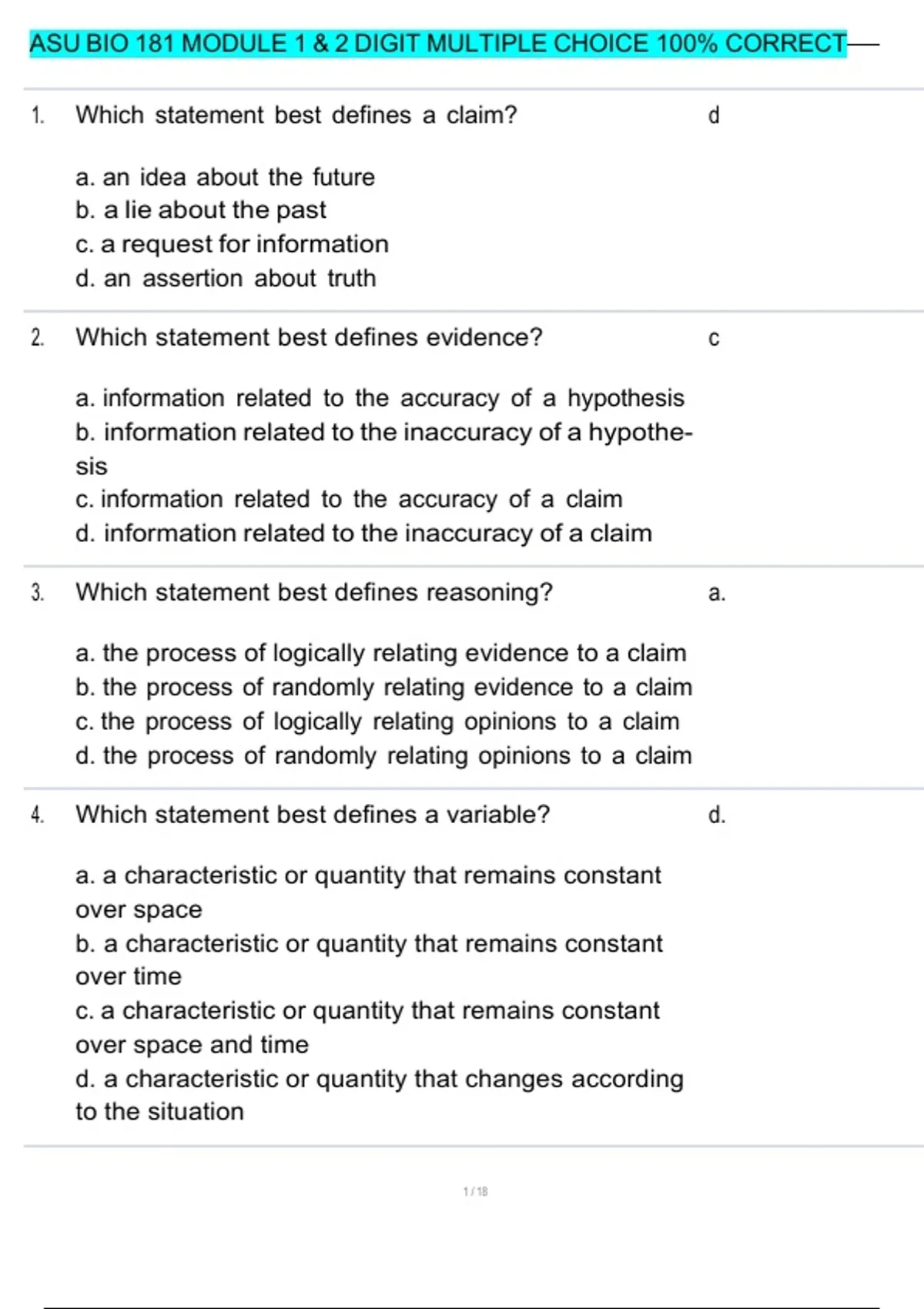 ,ASU BIO 181 MODULE 1 & 2 DIGIT MULTIPLE CHOICE 100% CORRECT
