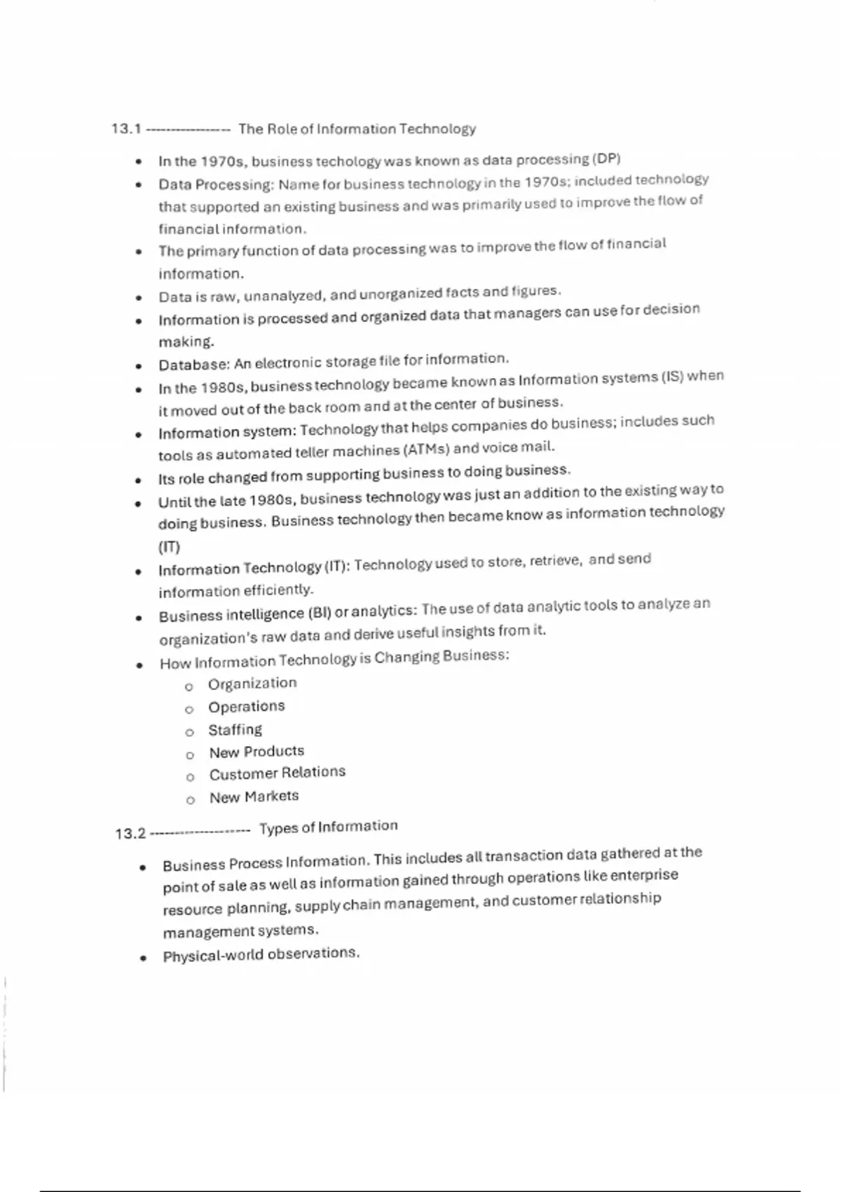 Well organized and easy to read notes. On topic and handles the major points of the chapter. Talks about the role of information technology and types of information. Used these notes on tests and always got high grades.