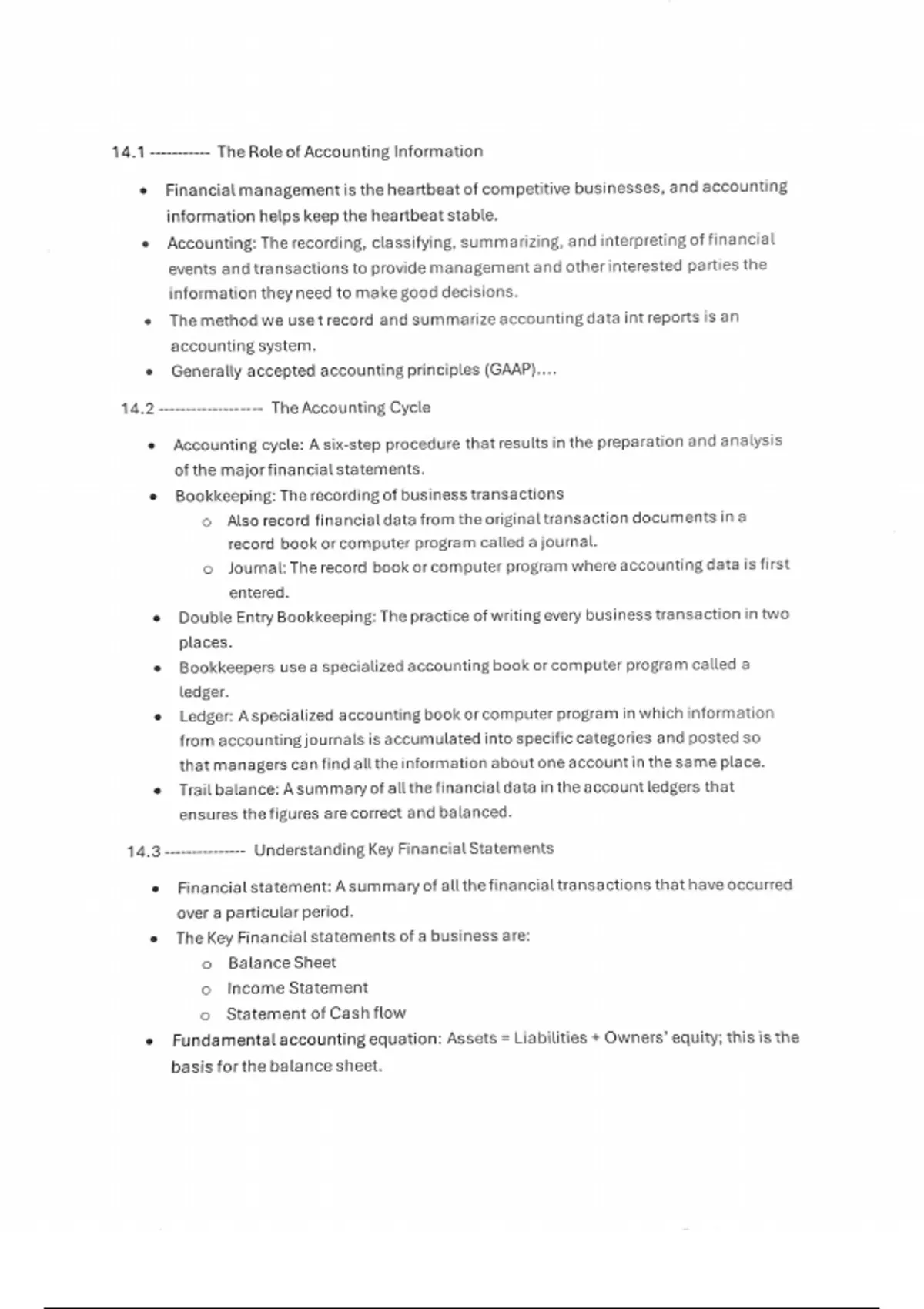 Well organized and easy to read notes. On topic and handles the major points of the chapter. Used these notes on chapter quiz and received high grade. This chapter is on accounting, the accounting cycle and its disciplines.
