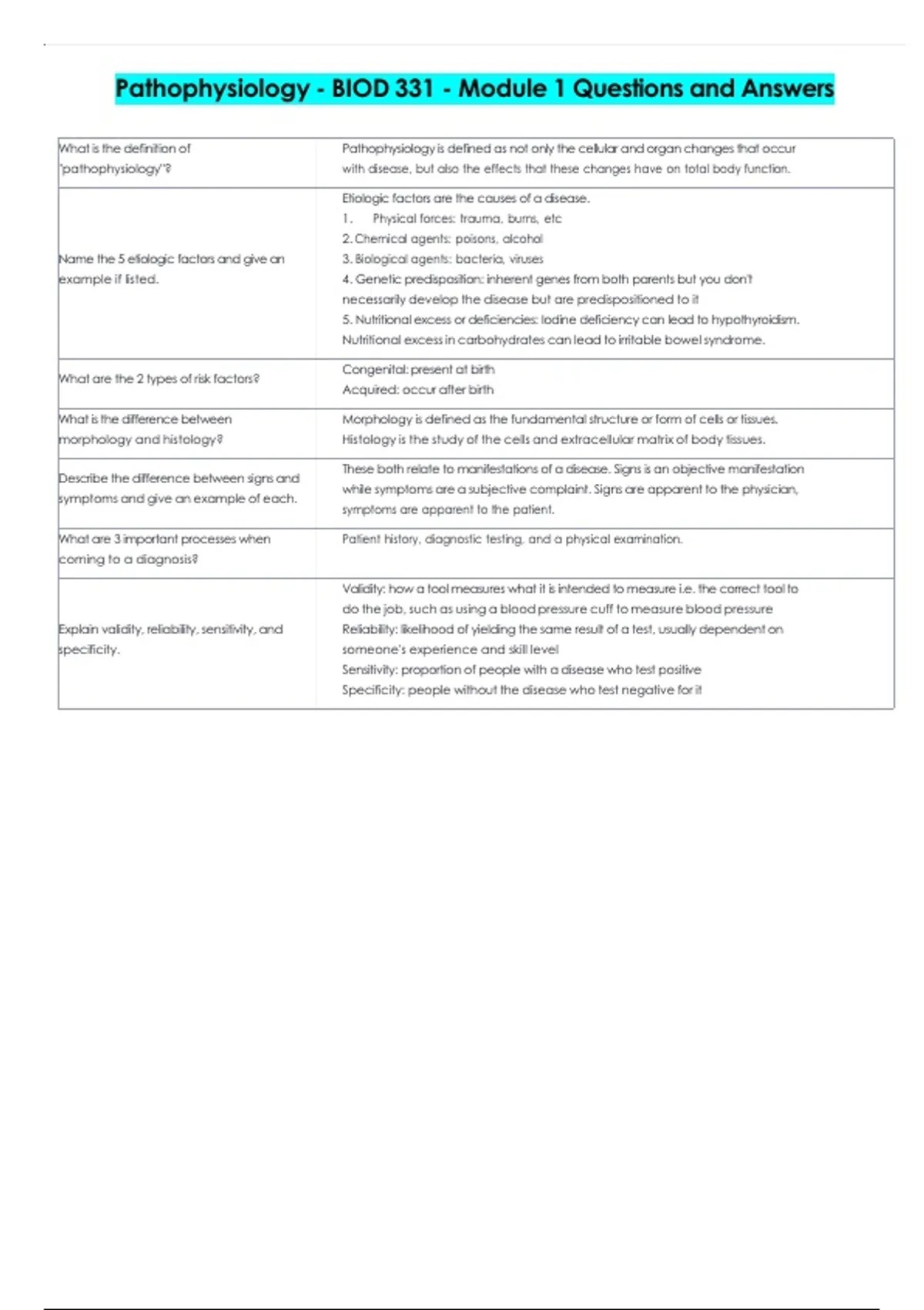 Pathophysiology - BIOD 331 - Module 1 Questions and Answers