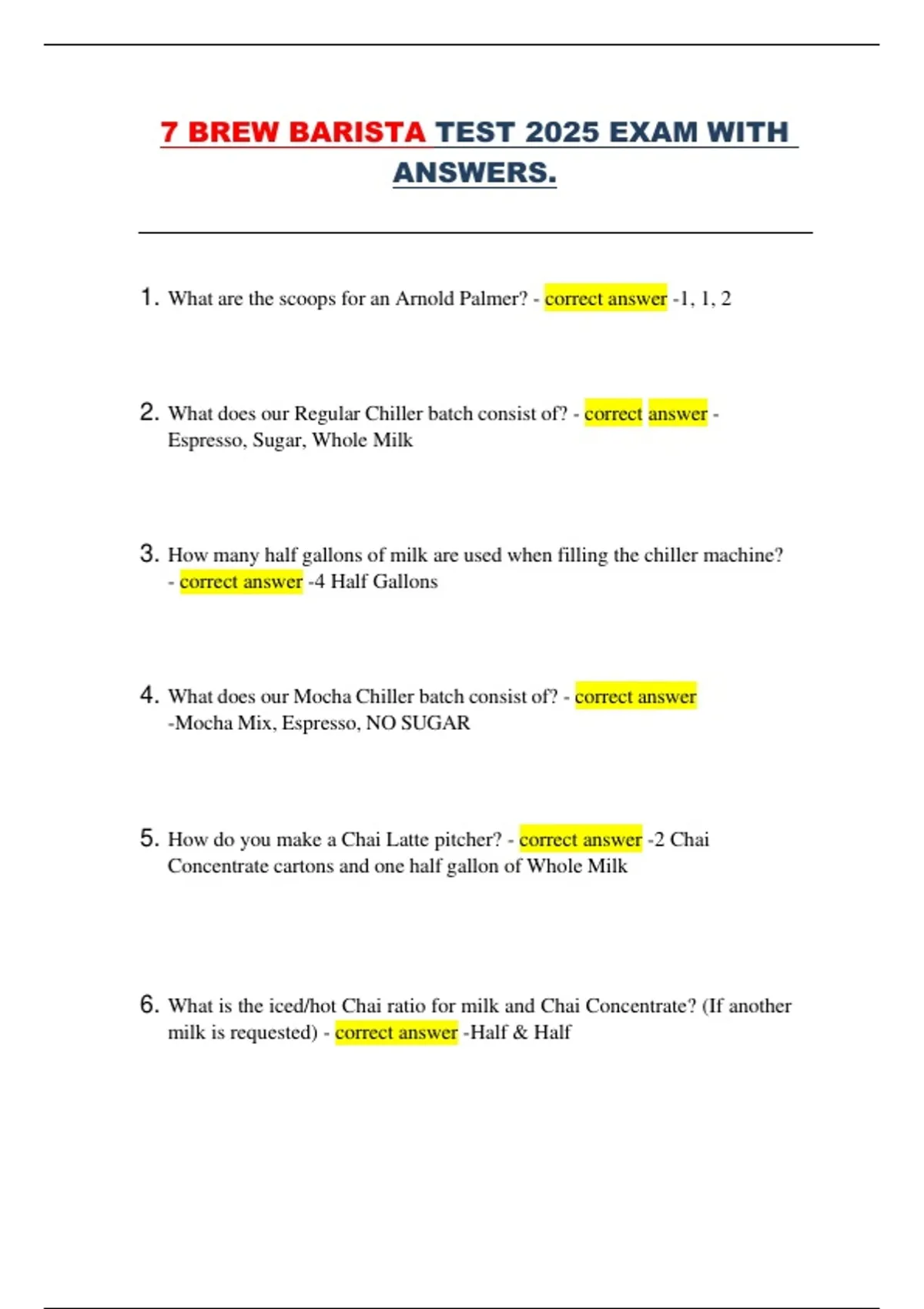 This document contains the full 2025 barista exam for 7 Brew, including all questions and correct answers across drink building, recipes, milk standards, espresso calibration, teas, energy drinks, chillers, smoothies, and Special 7 procedures. It covers precise scoop counts, fill lines, temperatures, milk choices, and flavor combinations required for accurate drink preparation. It is a complete study guide for baristas preparing for training, certification, or refreshers on 7 Brew standards.