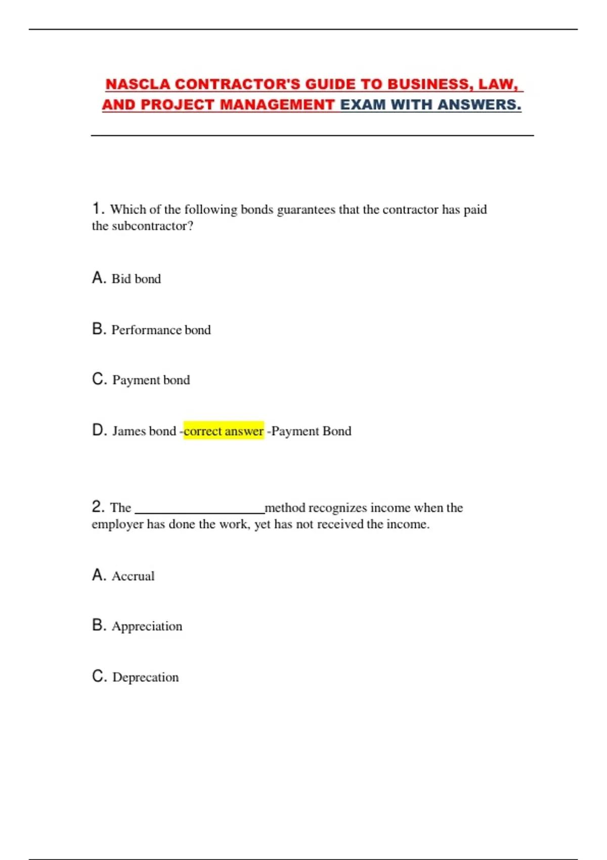 1. Which of the following bonds guarantees that the contractor has paid