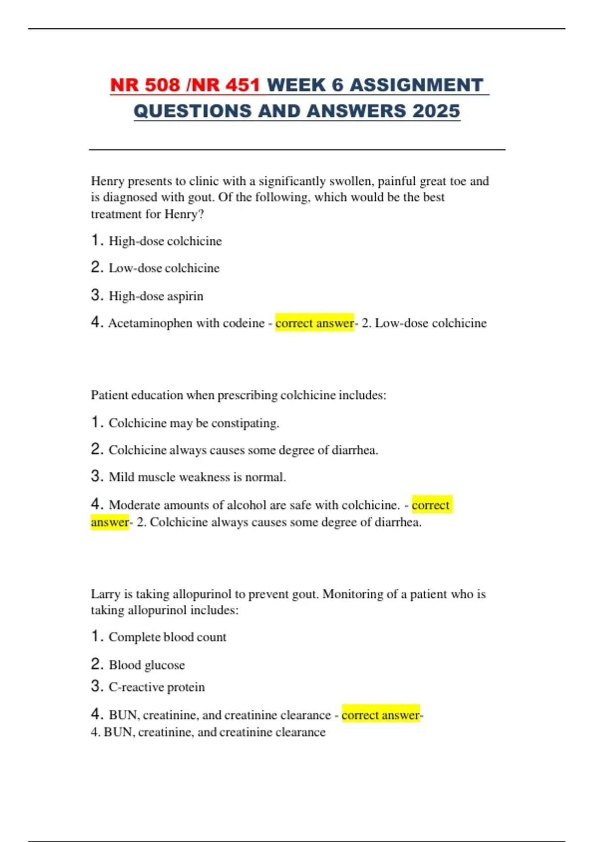 4. He will need frequent CBC monitoring. - correct answer- 1. Gout