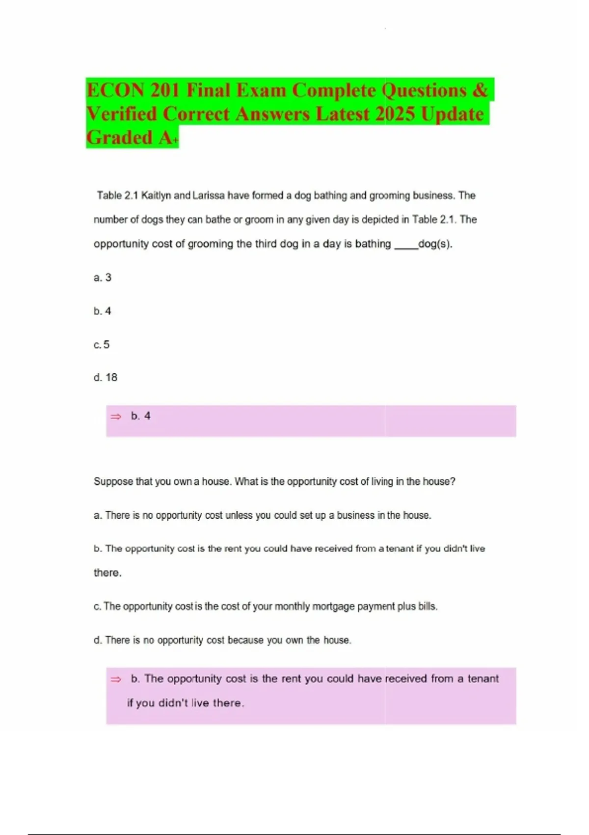 ECON 201 Final Exam Complete Questions & Verified Correct Answers Latest 2025 Update Graded A+Comprehensive ECON 201 Final Exam Study Guide with accurate questions and verified answers. Updated for 2025, this resource covers all major principles of microeconomics and macroeconomics with clear solutions and rationales. Perfect for students preparing for exams or reviewing key concepts in opportunity cost, diminishing returns, and market equilibrium. Content Coverage: - Opportunity Cost: - Dog bathing/grooming trade‑offs (Table 2.1). - Housing and parking spot examples. - Principle of Diminishing Returns: - Fertilizer application (Table 2.4). - Worker productivity (Table 2.3). - Why diminishing returns occur (fixed inputs). - Supply & Demand Analysis: - Jelly market with falling demand and rising input costs. - T‑shirt market equilibrium price adjustment. - Apple juice market with advertising (demand up) and freeze (supply down). - Market Outcomes: - Price and quantity changes under shifts in demand and supply. - Real‑world applications (TV purchases, consumer behavior). Features: - All exam questions with correct answers - Latest 2025 update - Verified and graded A+ content - Detailed rationales for deeper understanding - Perfect for exam prep, study sessions, and economics review