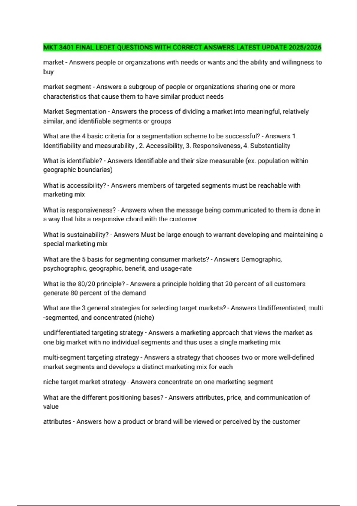 MKT 3401 FINAL LEDET QUESTIONS WITH CORRECT ANSWERS LATEST UPDATE 2025/2026 market - Answers people or organizations with needs or wants and the ability and willingness to buy market segment - Answers a subgroup of people or organizations sharing one or more characteristics that cause them to have similar product needs Market Segmentation - Answers the process of dividing a market into meaningful, relatively similar, and identifiable segments or groups What are the 4 basic criteria for a segmentation scheme to be successful? - Answers 1. Identifiability and measurability , 2. Accessibility, 3. Responsiveness, 4. Substantiality What is identifiable? - Answers Identifiable and their size measurable (ex. population within geographic boundaries) What is accessibility? - Answers members of targeted segments must be reachable with marketing mix What is responsiveness? - Answers when the message being communicated to them is done in a way that hits a responsive chord with the customer What is sustainability? - Answers Must be large enough to warrant developing and maintaining a special marketing mix What are the 5 basis for segmenting consumer markets? - Answers Demographic, psychographic, geographic, benefit, and usage-rate What is the 80/20 principle? - Answers a principle holding that 20 percent of all customers generate 80 percent of the demand What are the 3 general strategies for selecting target markets? - Answers Undifferentiated, multi-segmented, and concentrated (niche) undifferentiated targeting strategy - Answers a marketing approach that views the market as one big market with no individual segments and thus uses a single marketing mix multi-segment targeting strategy - Answers a strategy that chooses two or more well-defined market segments and develops a distinct marketing mix for each niche target market strategy - Answers concentrate on one marketing segment What are the different positioning bases? - Answers attributes, price, and communication of value attributes - Answers how a product or brand will be viewed or perceived by the customer price - Answers decision regarding how to price a product is important to the overall brand and perception of the product communication of value - Answers gives companies an opportunity to position their company against the competition by using emotion to help persuade customers What are the 4 types of consumer products? - Answers 1. Convenience 2. Shopping 3. Specialty 4. Unsought