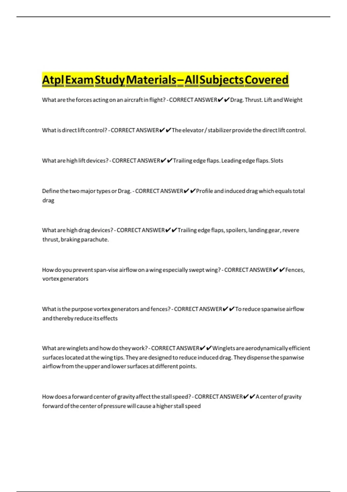 What are the forces acting on an aircraft in flight? - CORRECT ANSWER✔✔Drag. Thrust. Lift and Weight