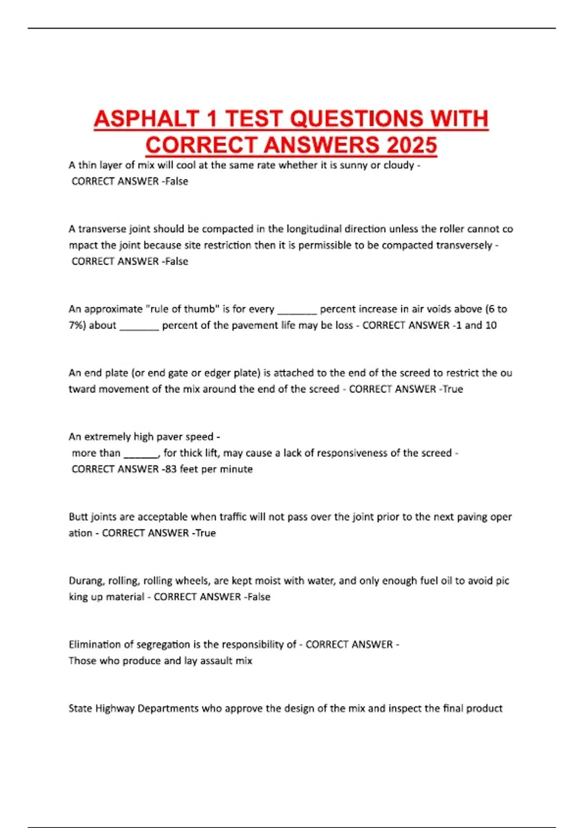 ASPHALT 1 TEST QUESTIONS WITH CORRECT ANSWERS 2025