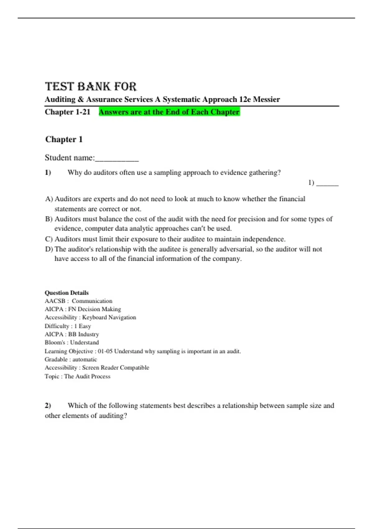 Test Bank for Auditing & Assurance Services A Systematic Approach 12e Messier