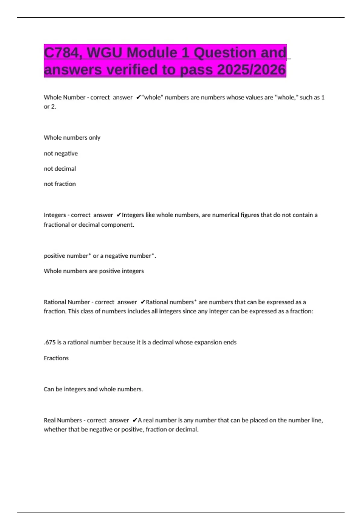 Real Numbers - correct answer ✔A real number is any number that can be placed on the number line,